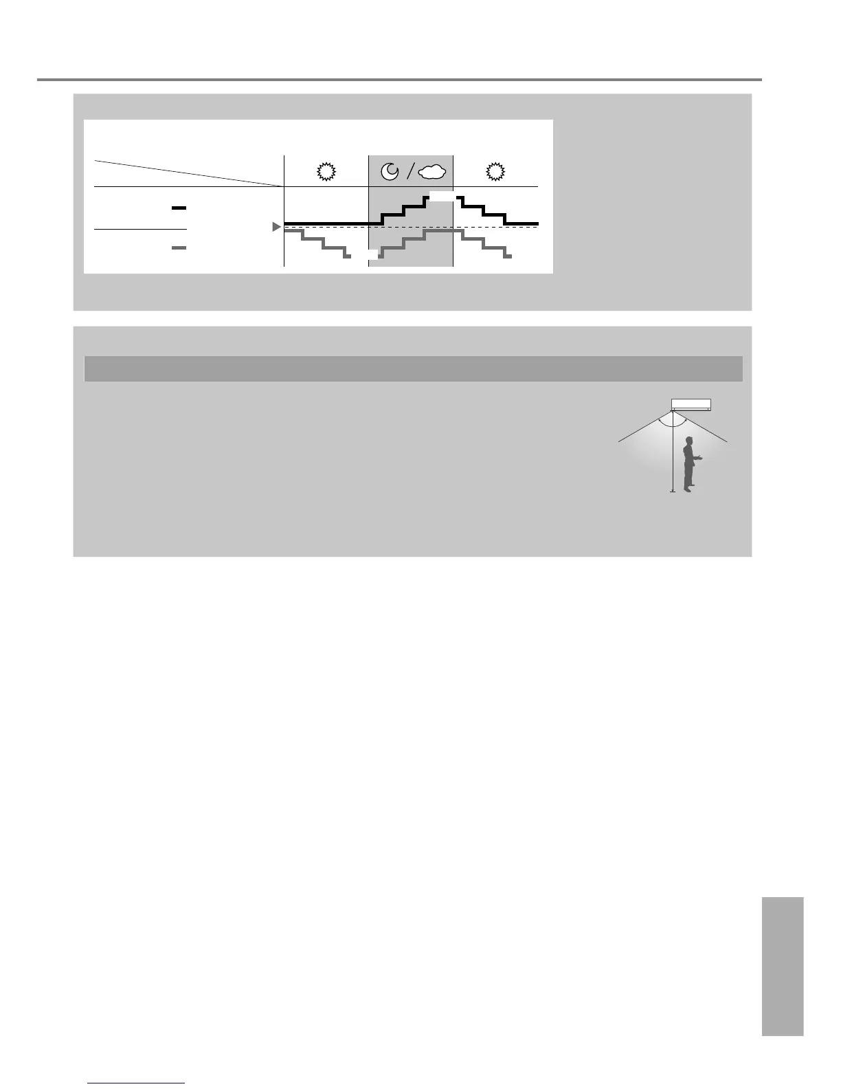 • In een vertrek zonder venster of met een dik gordijn zal de zonlichtsensor de omstandigheden beoordelen als