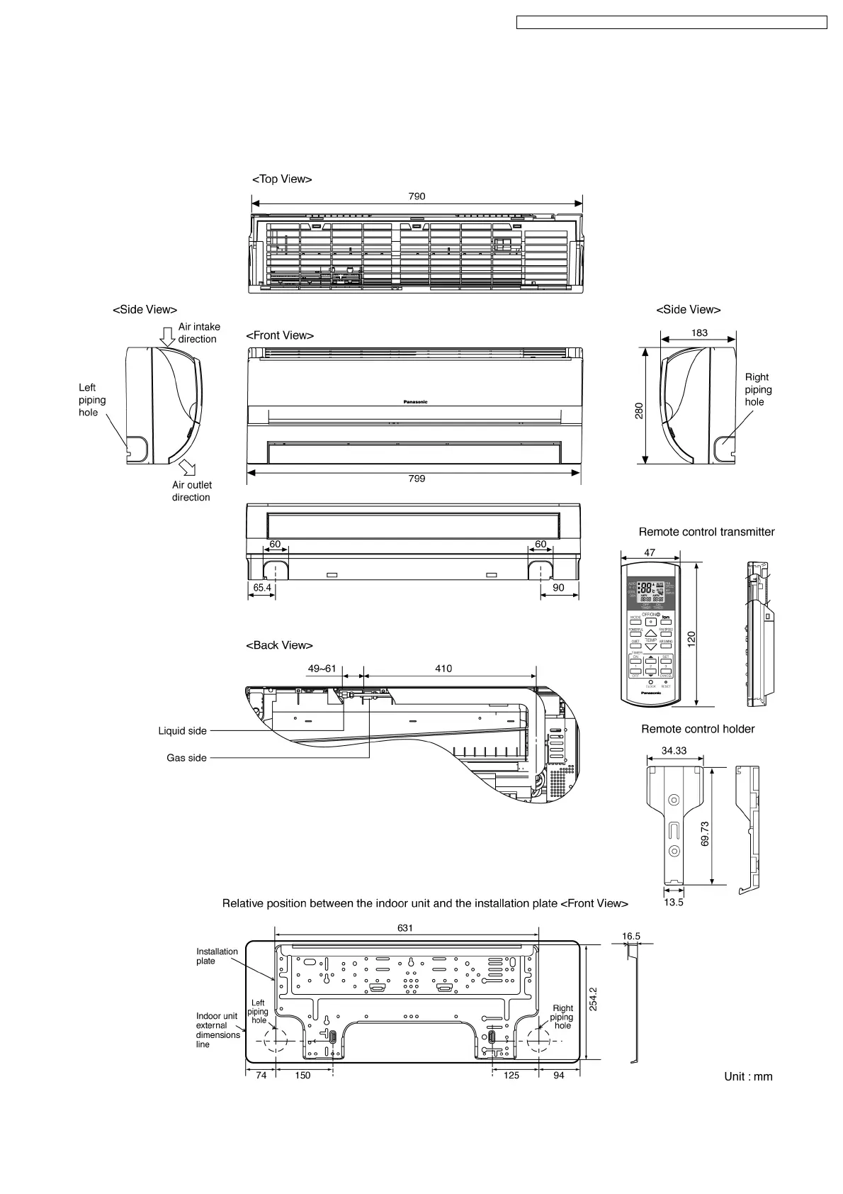 Panasonic CU-W12DKE - 4 Dimensions; Indoor Unit & Remote Control