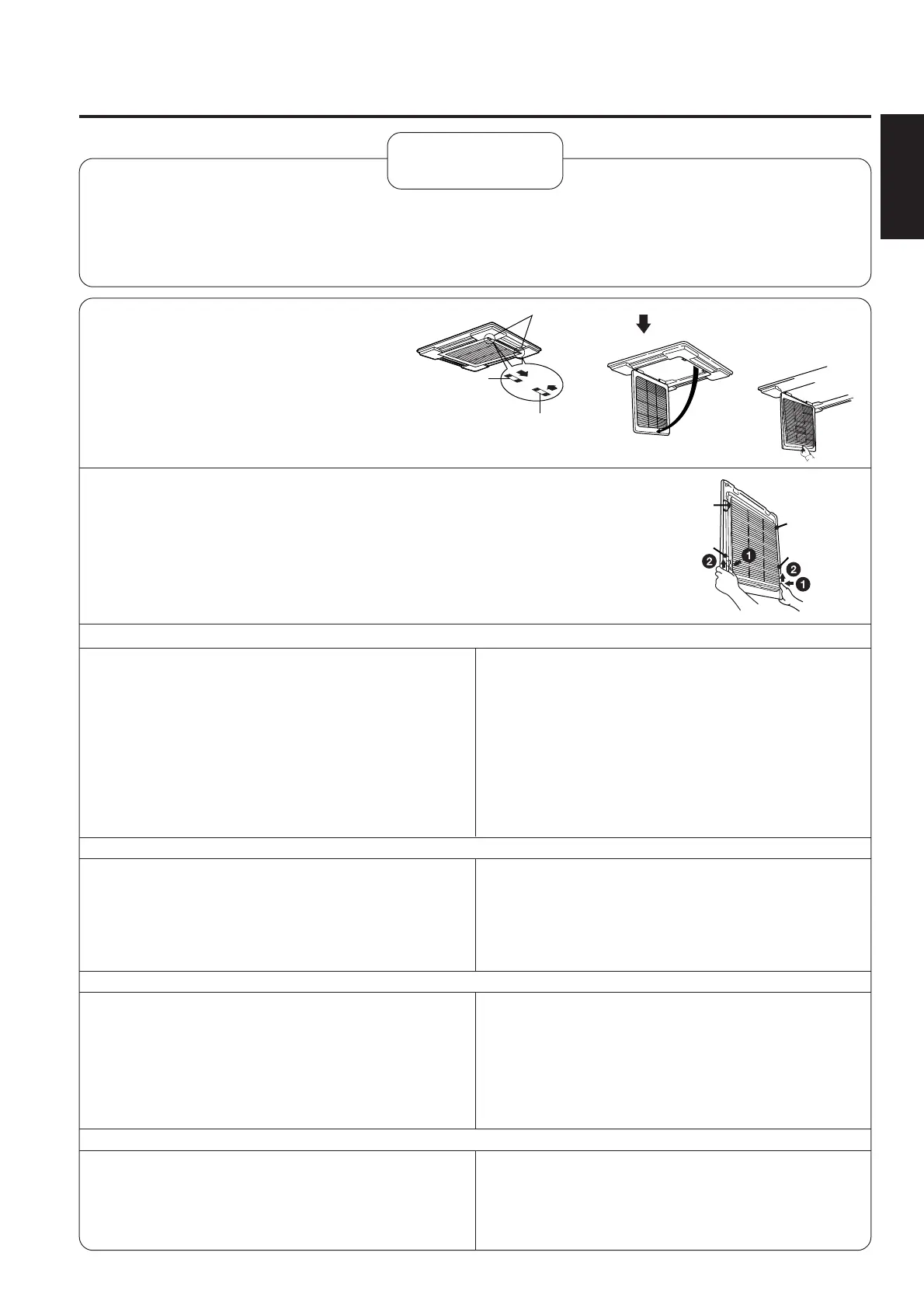 1 Insert the air filter to the hooks of the grille for fixing (4 positions).
