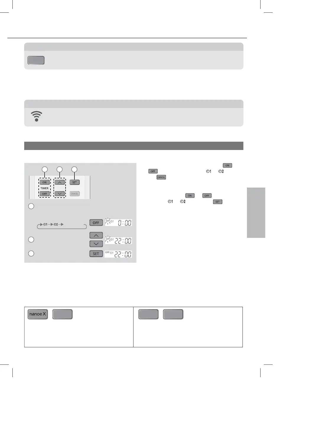 2 sets of ON and OFF timers are available to turn ON or OFF the unit at different preset time.