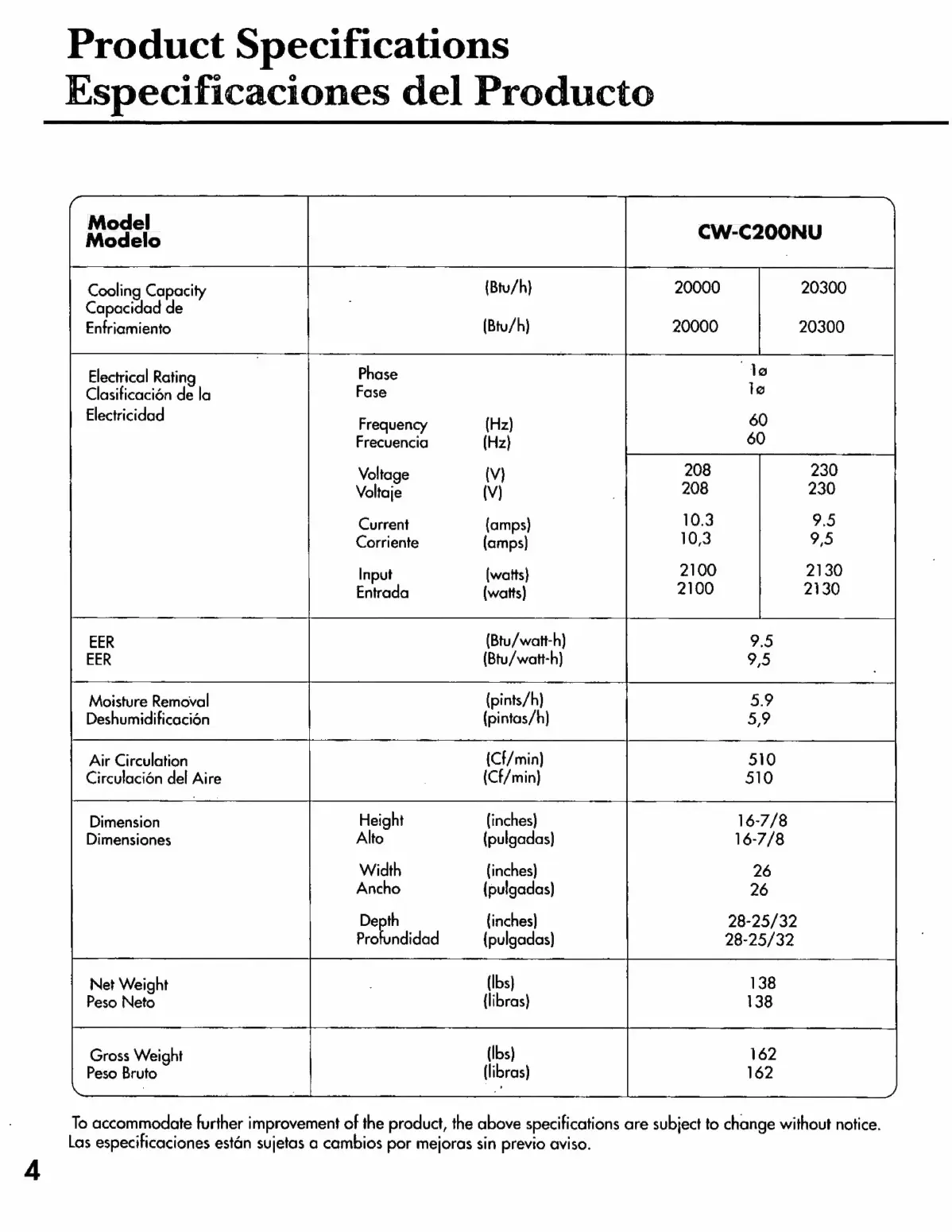 Panasonic CW-C200NU - Product Specifications; Especificaciones del Producto