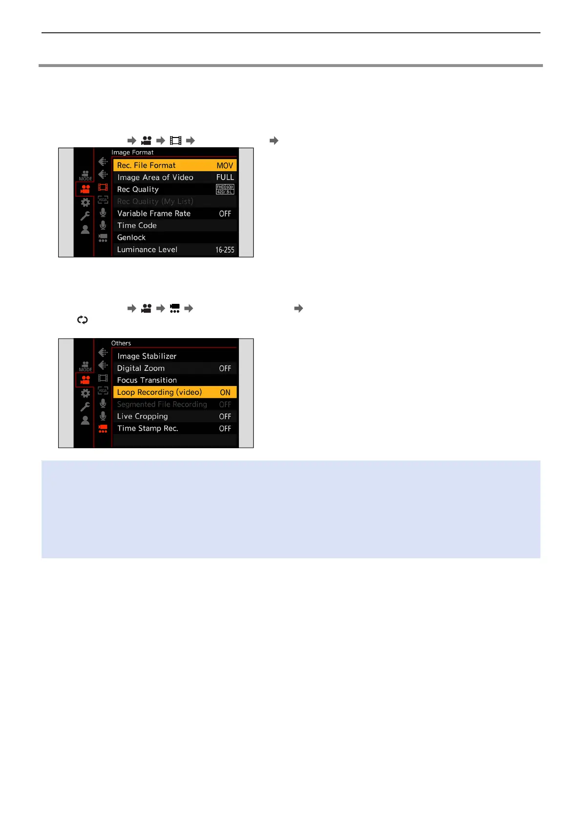 [MENU/SET] [ ] [ ] [Loop Recording (video)] [ON]