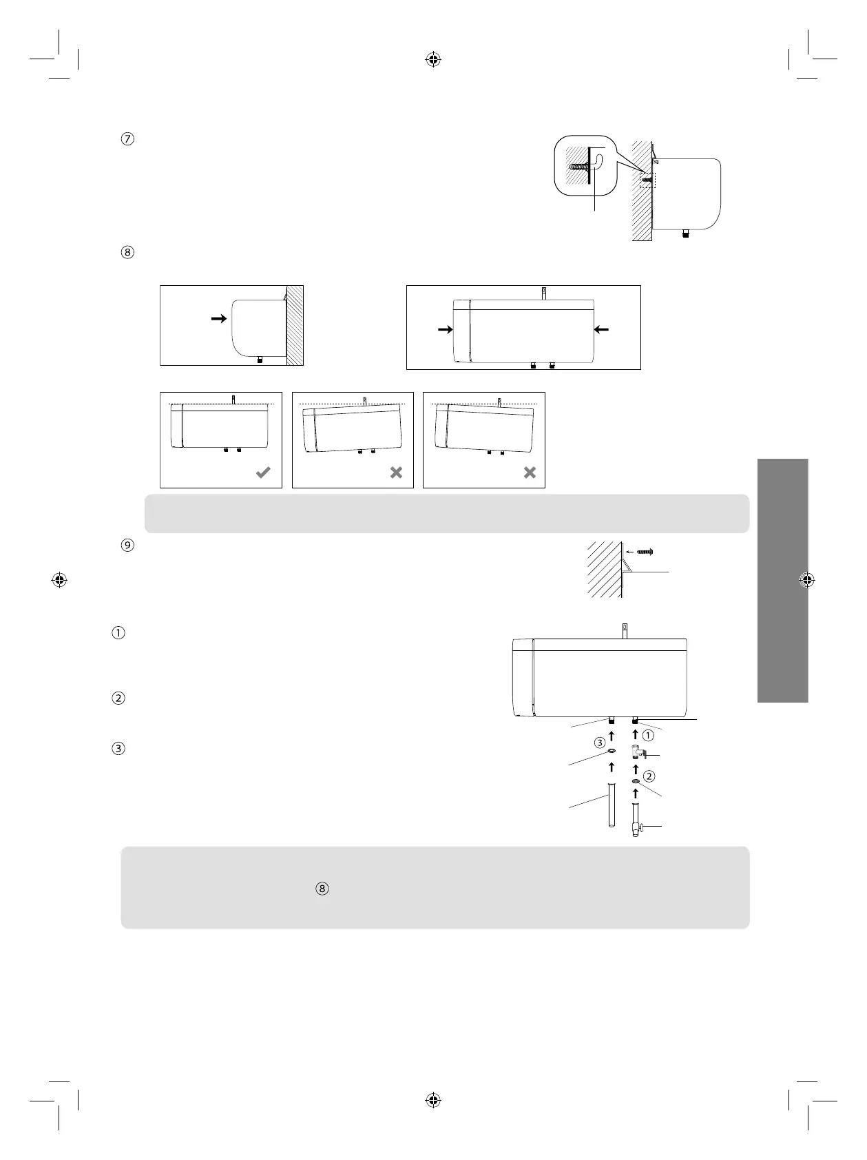 • After completion of pipe installation, ensure that the appliance is not in slanting position as indicated in item no.2