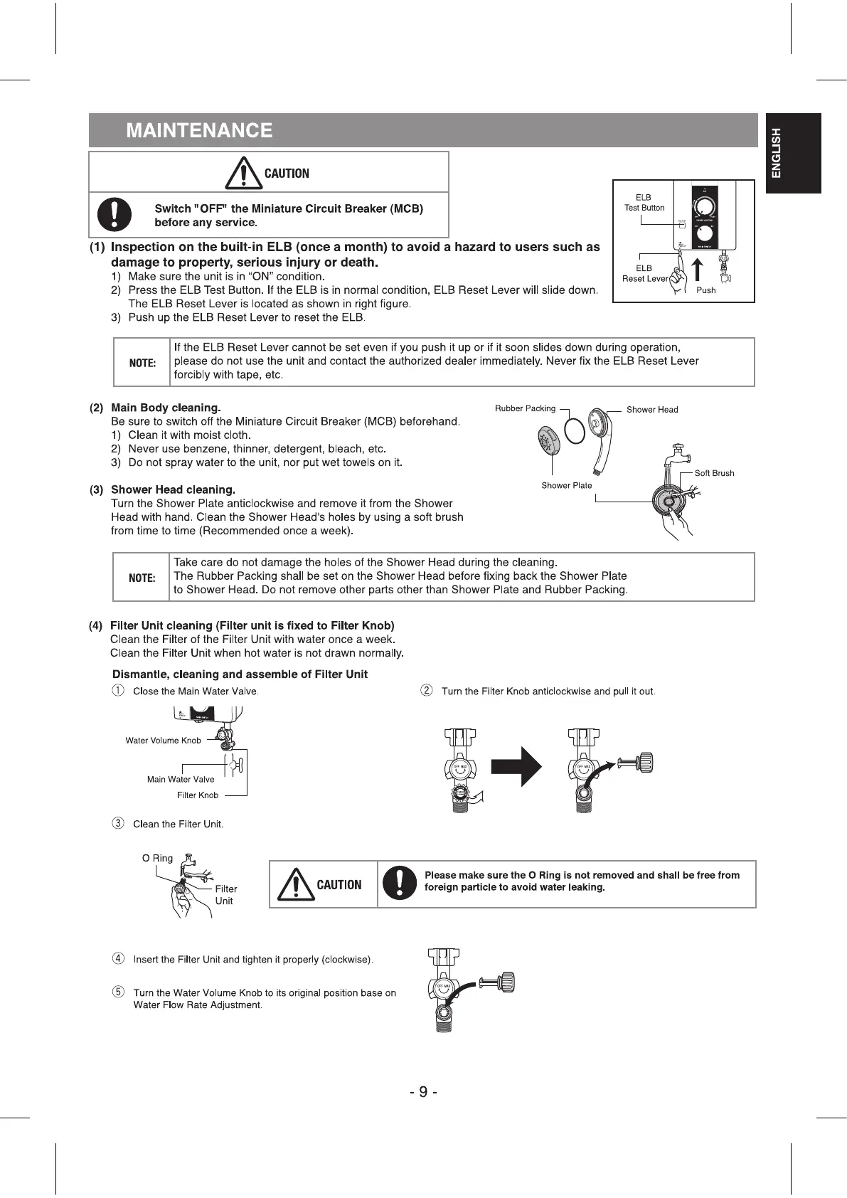 Panasonic DH-3JP2 - Maintenance; Built-in ELB Inspection; Main Body Cleaning; Shower Head Cleaning