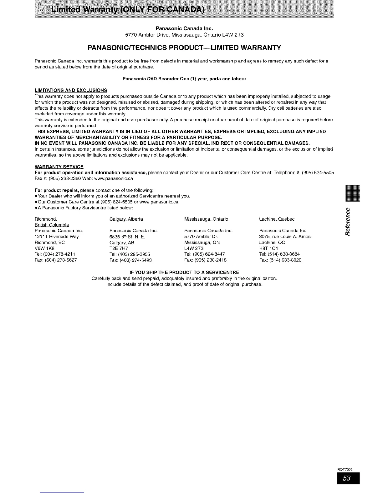 eOur Customer Care Centre at (905) 624-5505 or www.panasonic.ca