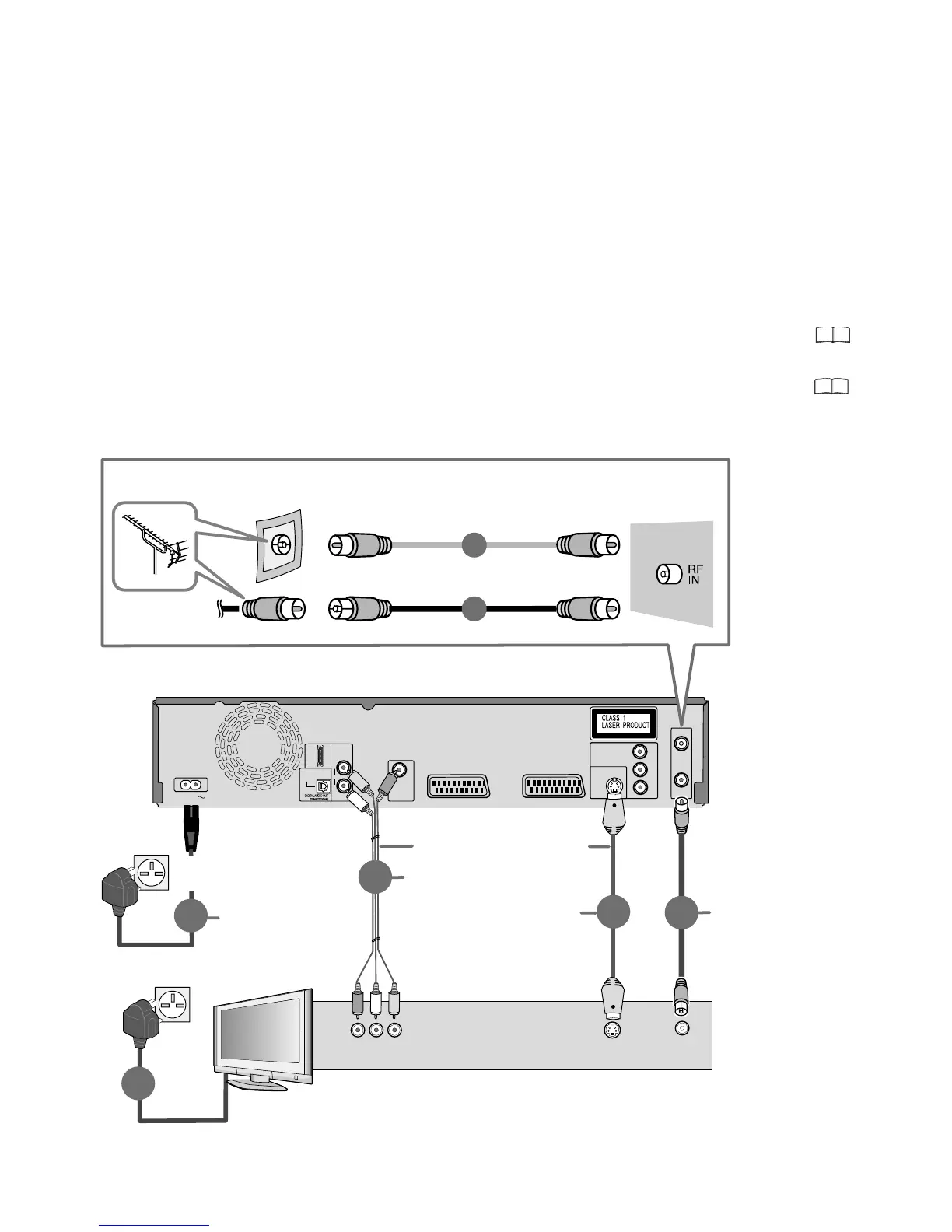 1 Connect the aerial to RF IN (Aerial input) of the DVD Recorder.