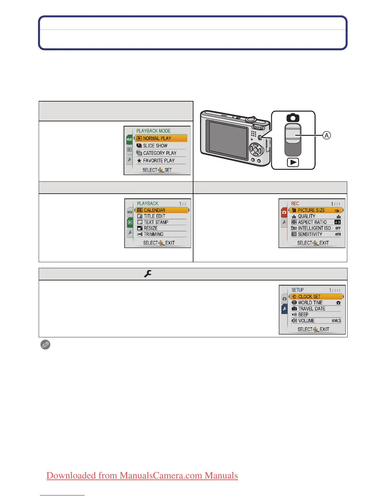 clock and power. Check the settings of this menu before proceeding to use the camera.