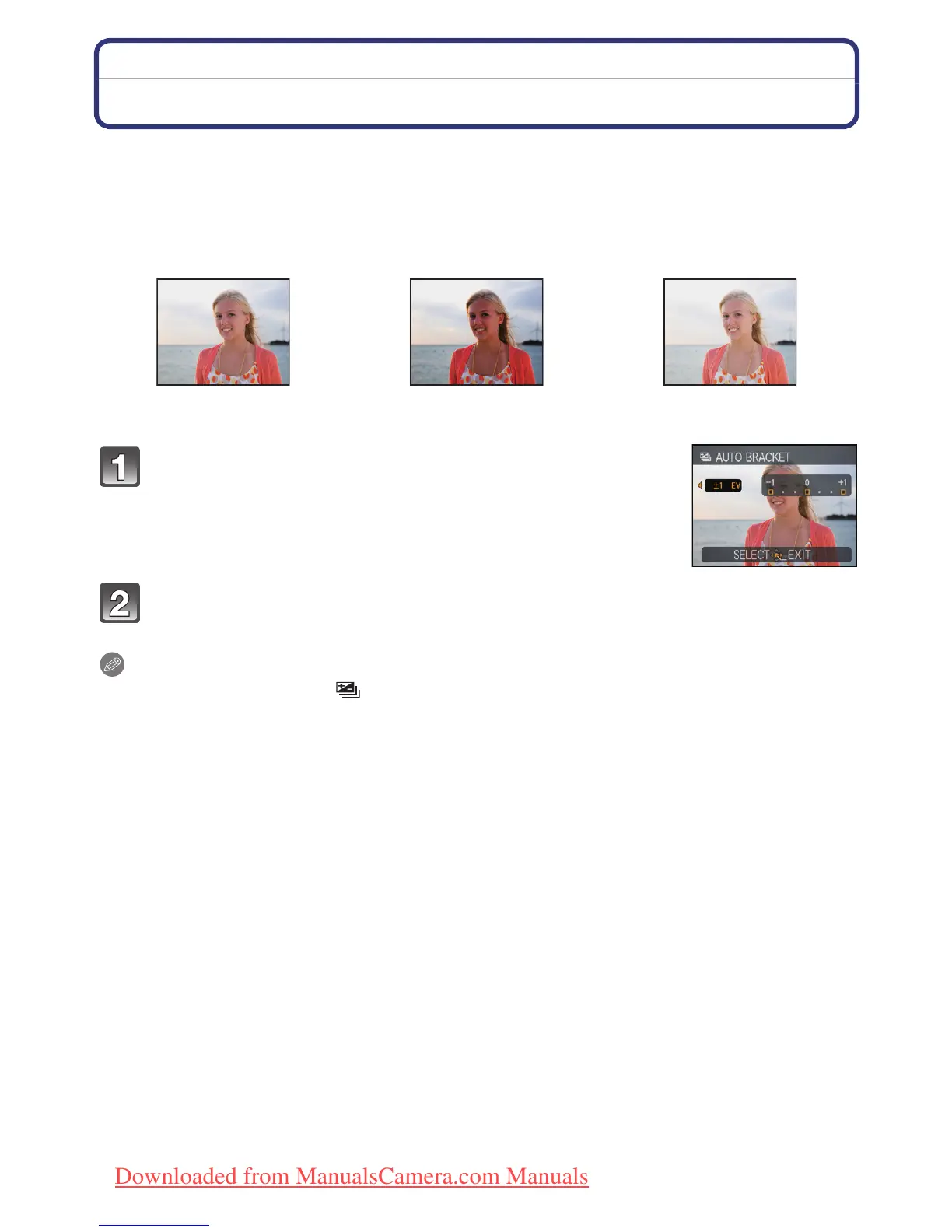 • When taking pictures using Auto Bracket after setting the exposure compensation range, the