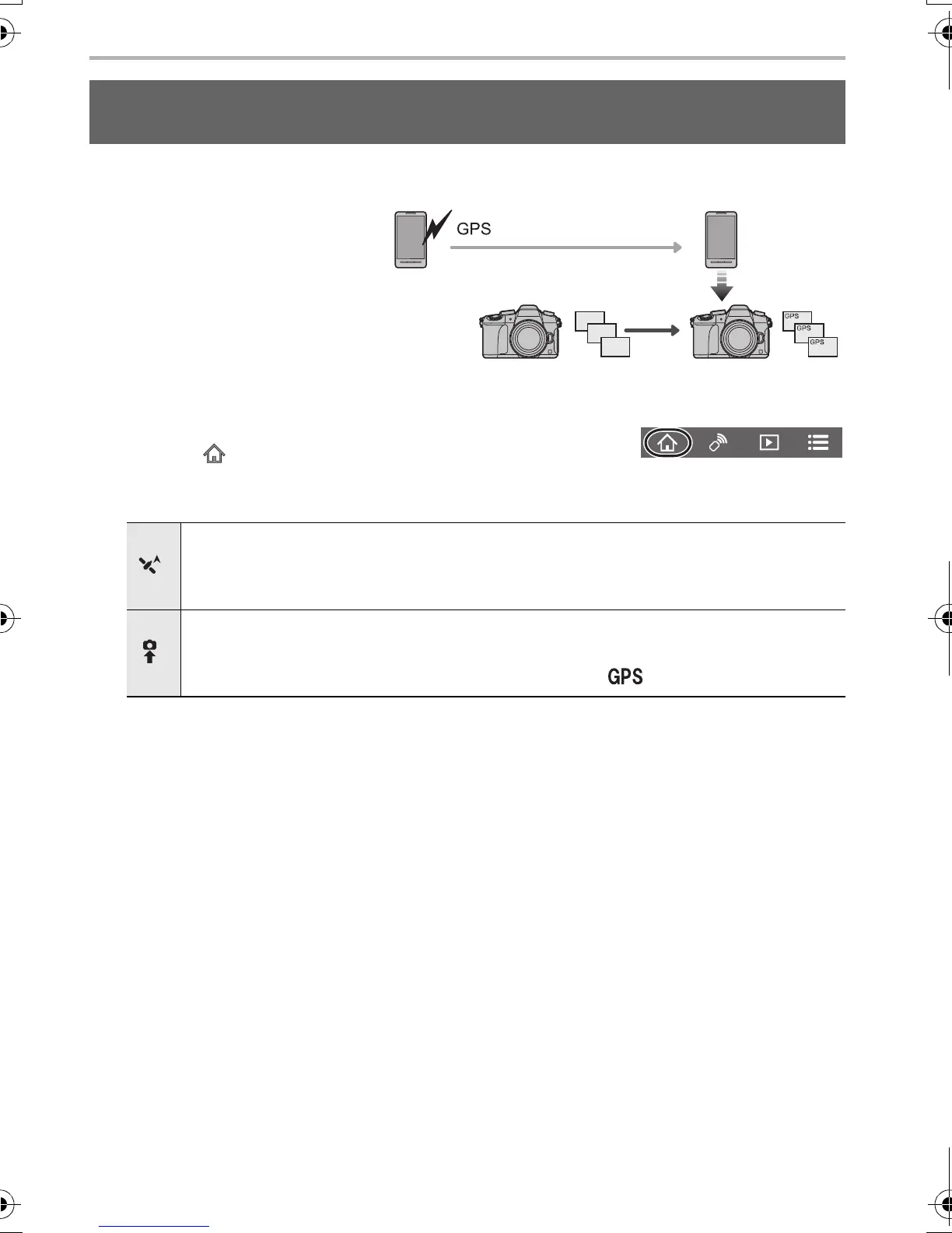 You can send location information acquired with a smartphone to the camera. After