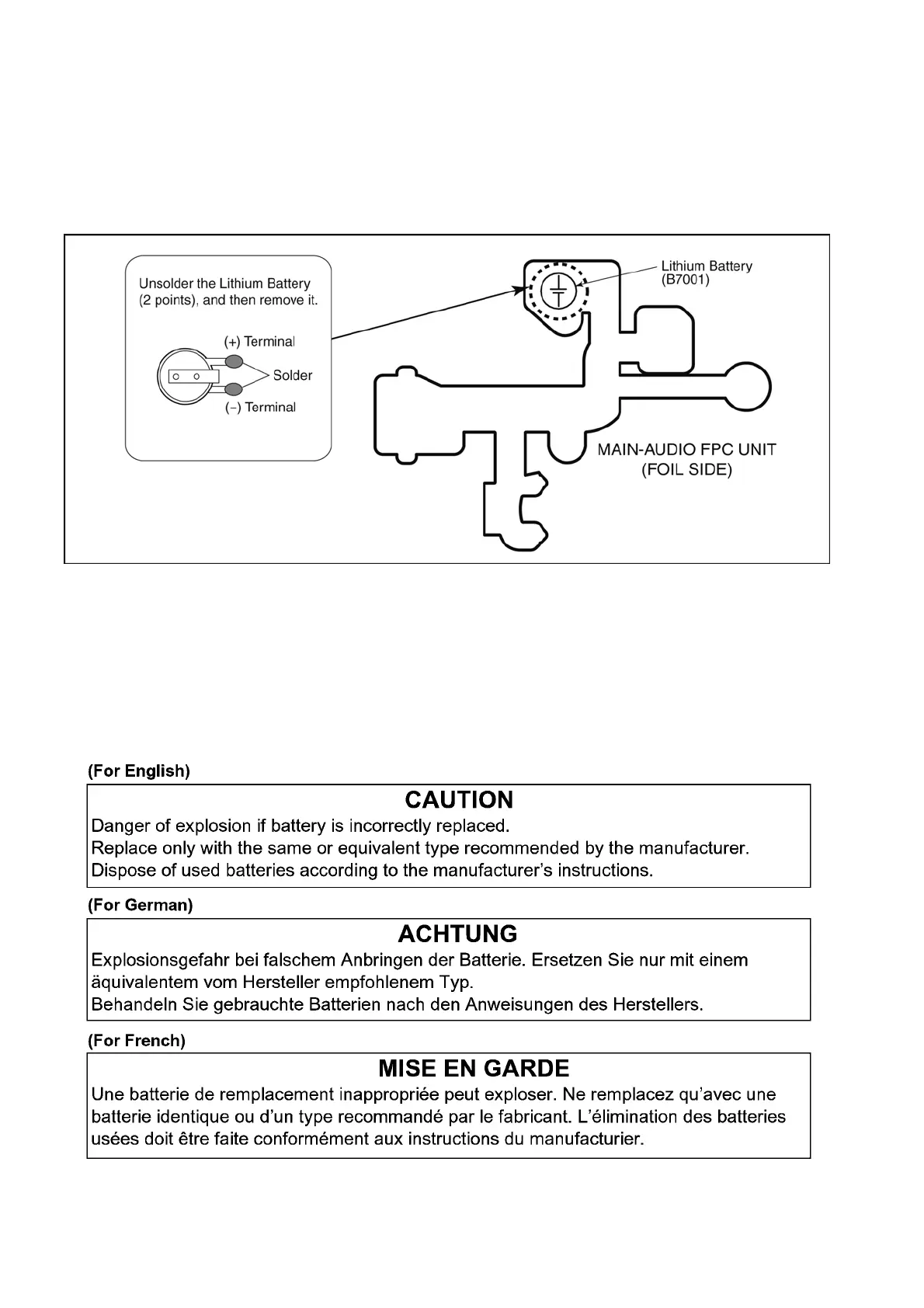 2. Unsolder the each soldering point of electric lead terminal for Lithium battery (Ref. No. “B7001” at foil side of MAIN-AUDIO