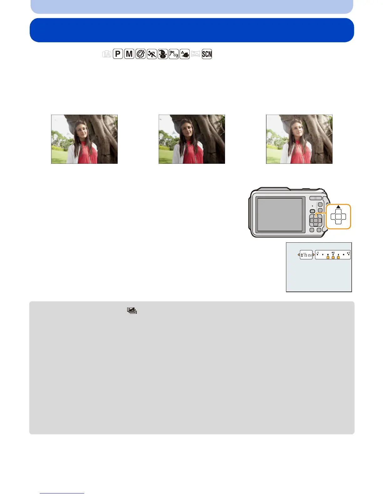 In this mode, 3 pictures are automatically recorded in the selected exposure compensation