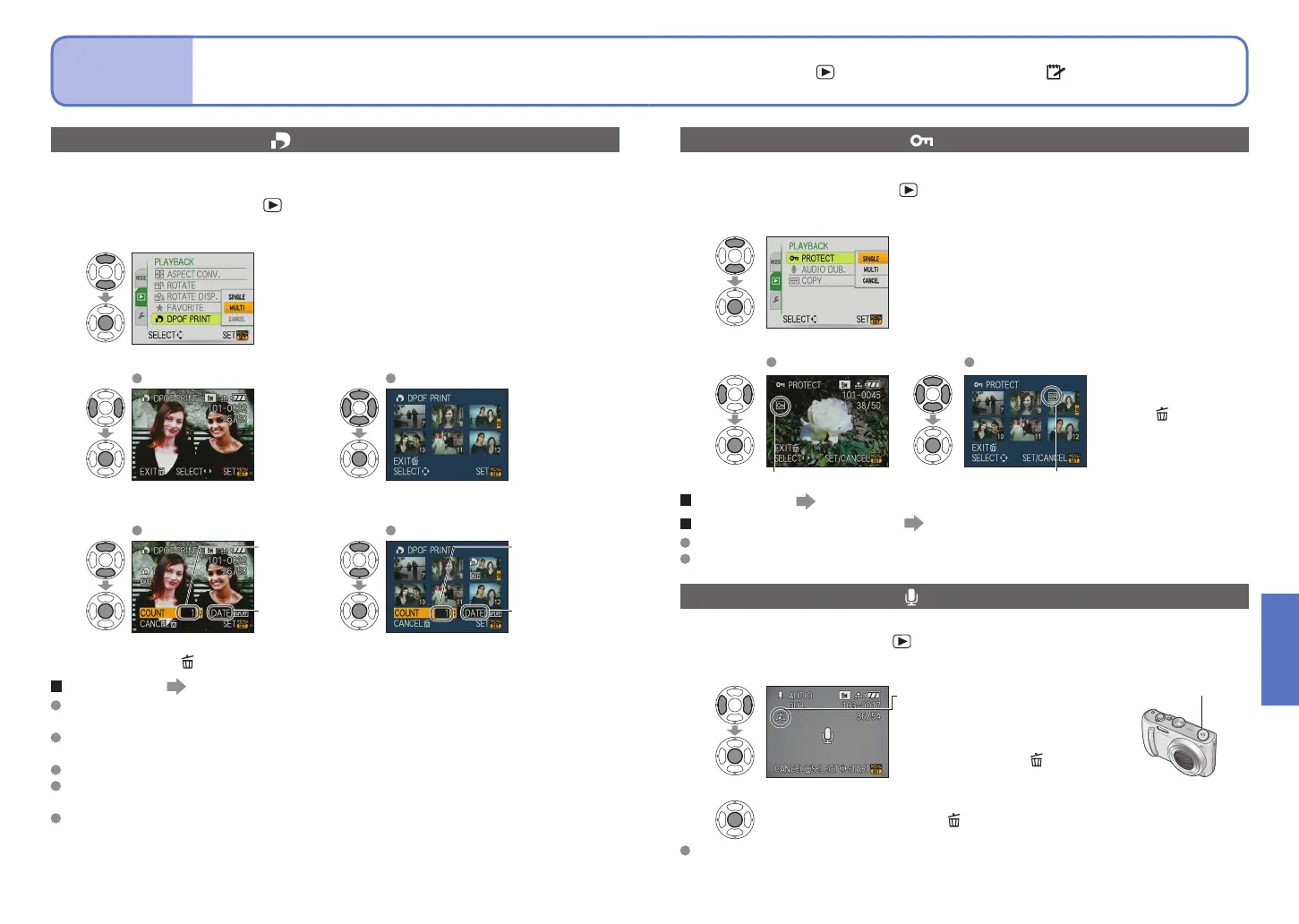 Set-up: Press ‘MENU/SET’ → ‘ PLAYBACK menu’ → Select ‘PROTECT’ (P.20)
