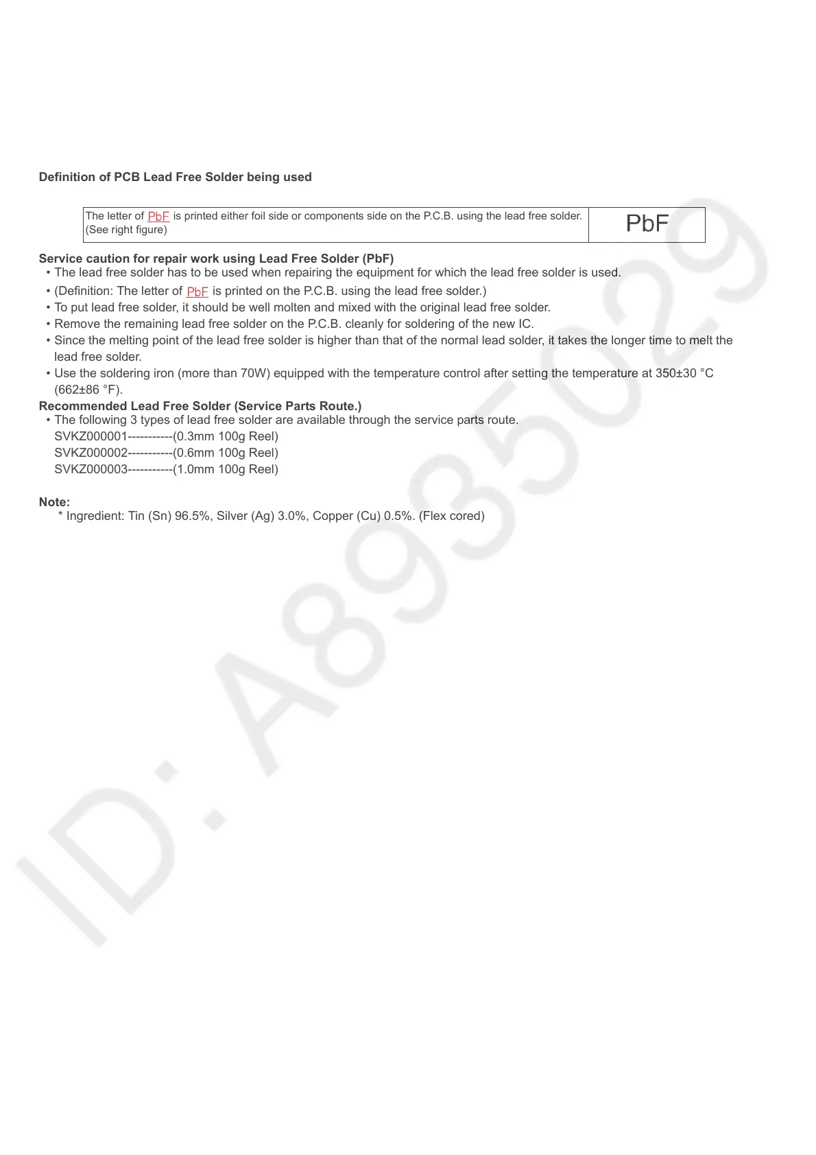 Recommended Lead Free Solder (Service Parts Route.)