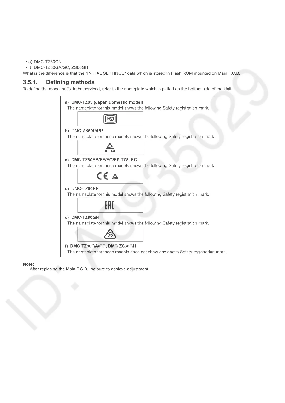 After replacing the Main P.C.B., be sure to achieve adjustment.