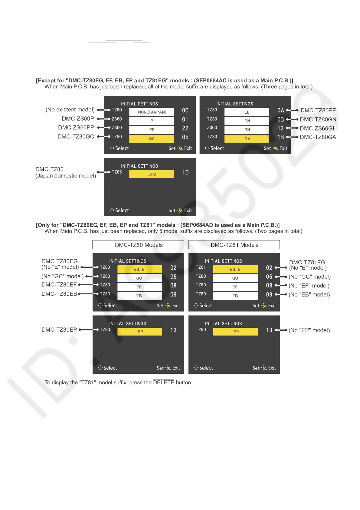When Main P.C.B. has just been replaced, all of the model suffix are displayed as follows. (Three pages in total)