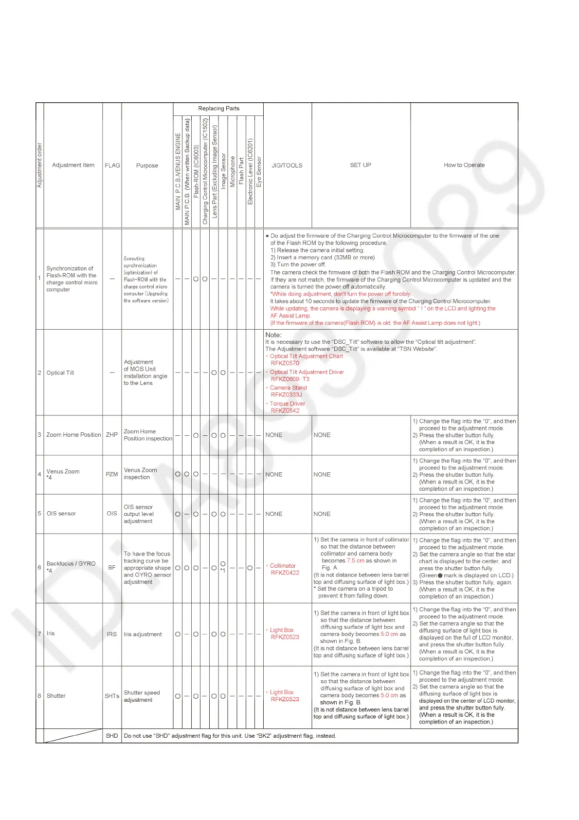 The following matrix table shows the relation between the replaced part and the Necessary Adjustment.