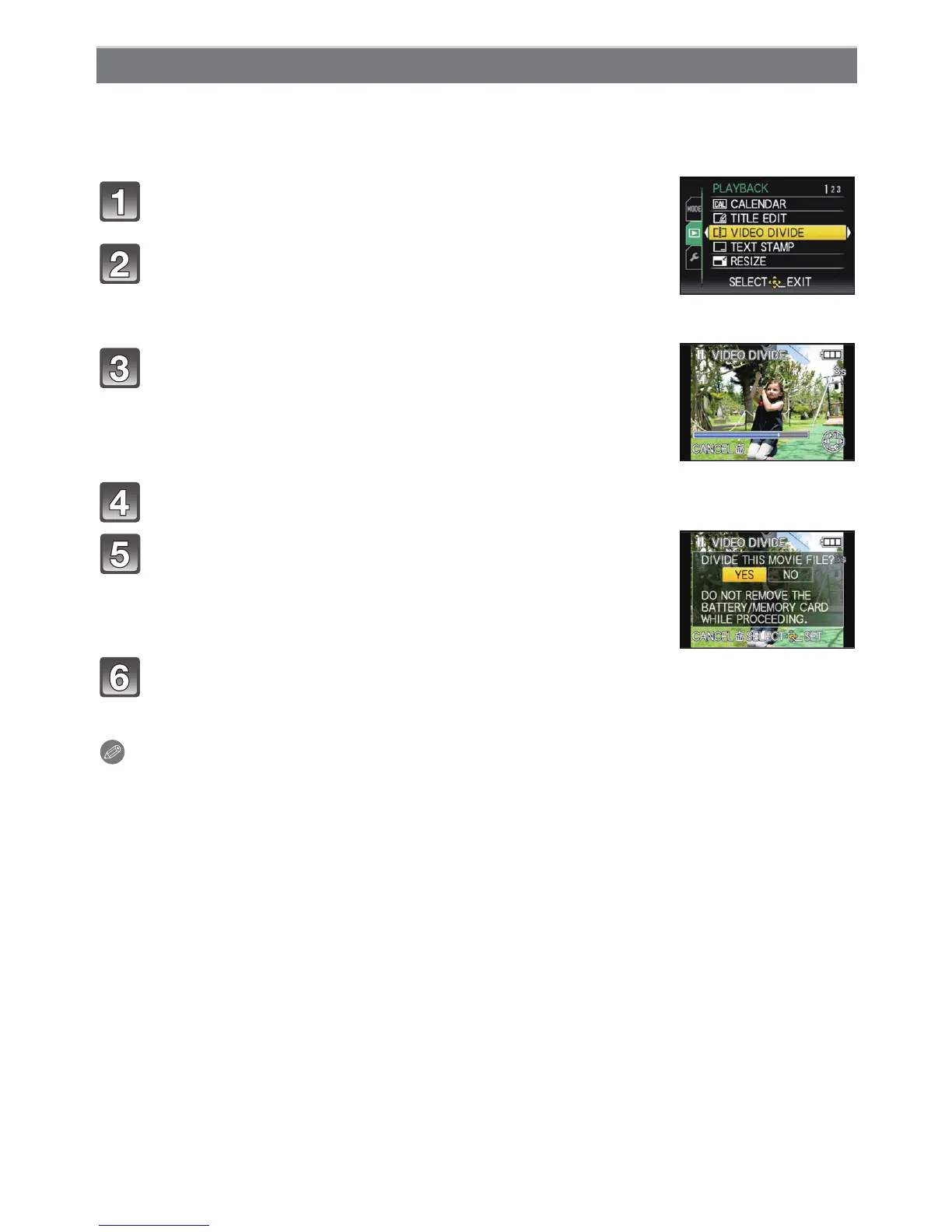 • [VIDEO DIVIDE] may not be performed on motion pictures recorded with other equipment.