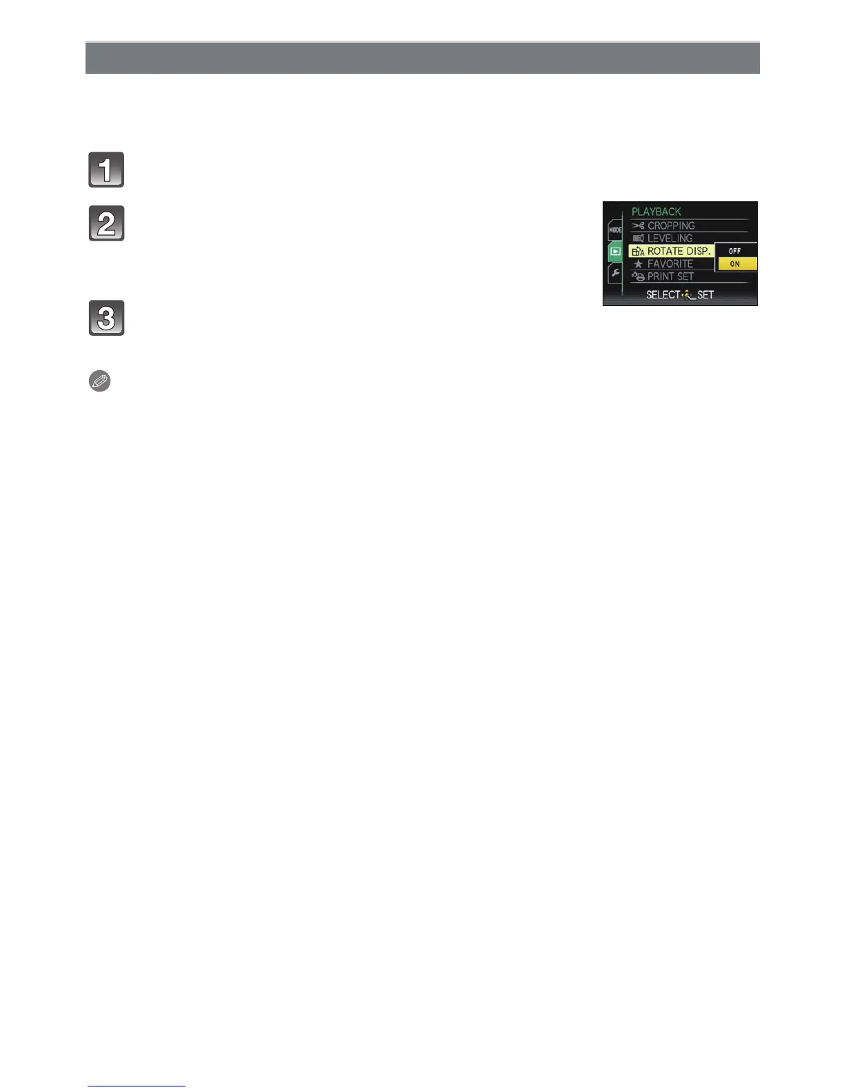 Select [ROTATE DISP.] on the [PLAYBACK] Mode menu. (P28)