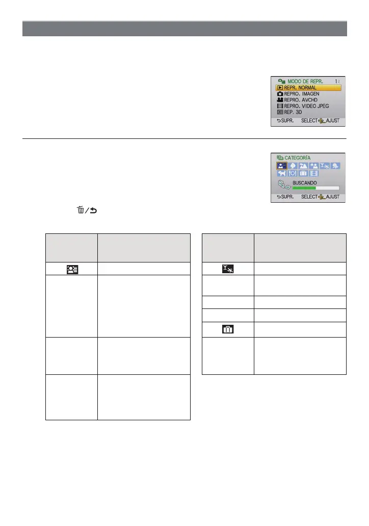 [REPRO. AVCHD], [REPRO. VIDEO JPEG], [REP. 3D], [REPR. CATEG.] o [REPR. FAV.].