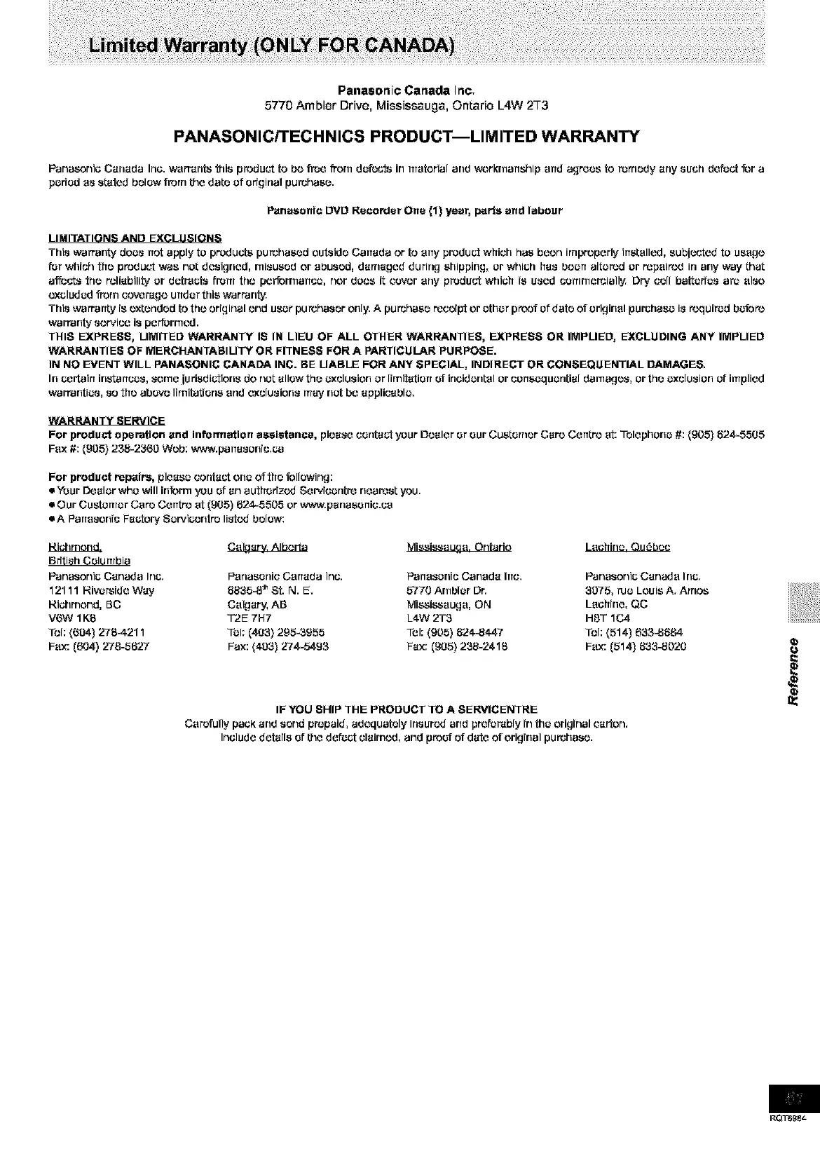 Panasonic Canada Inc. _arr'drlts this produ_'t to be free frorn defects in material and workrnartship ortd a,qroos to rorrrudy any such dotsct lot a