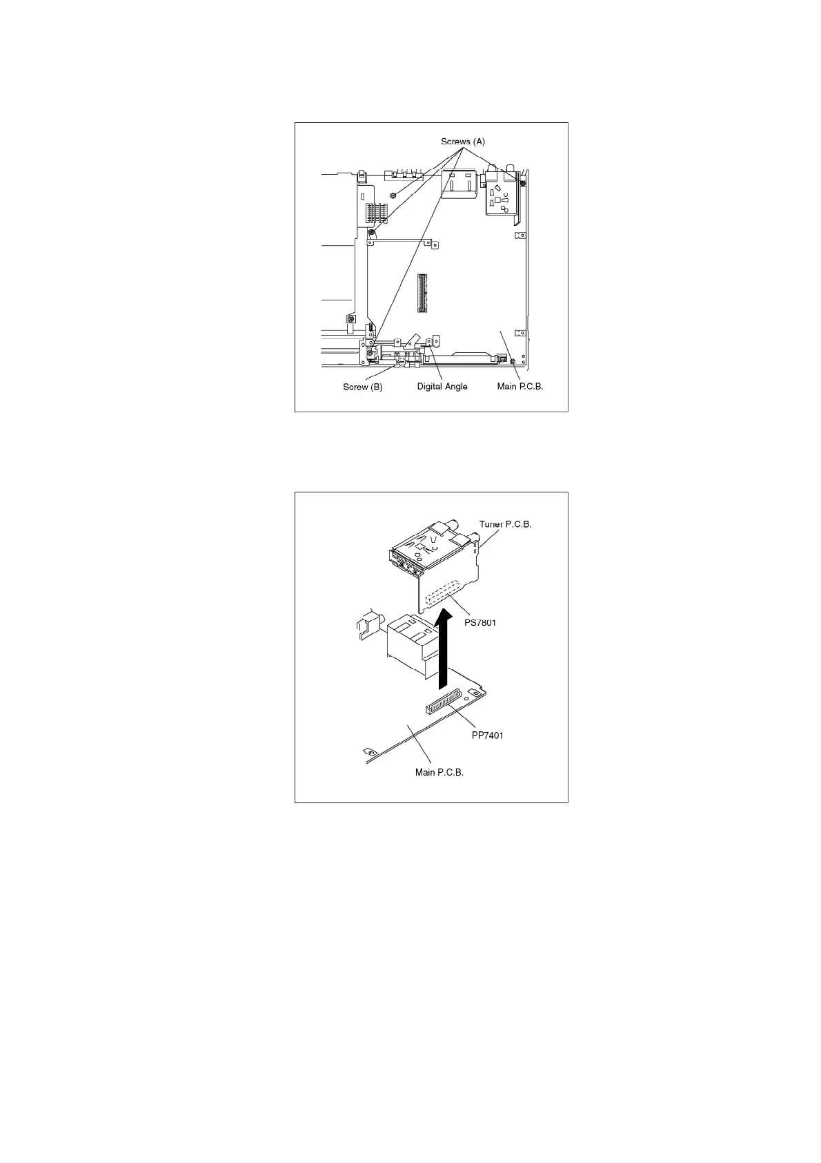 1. Pull out the Tuner P.C.B. in the direction of the arrow.
