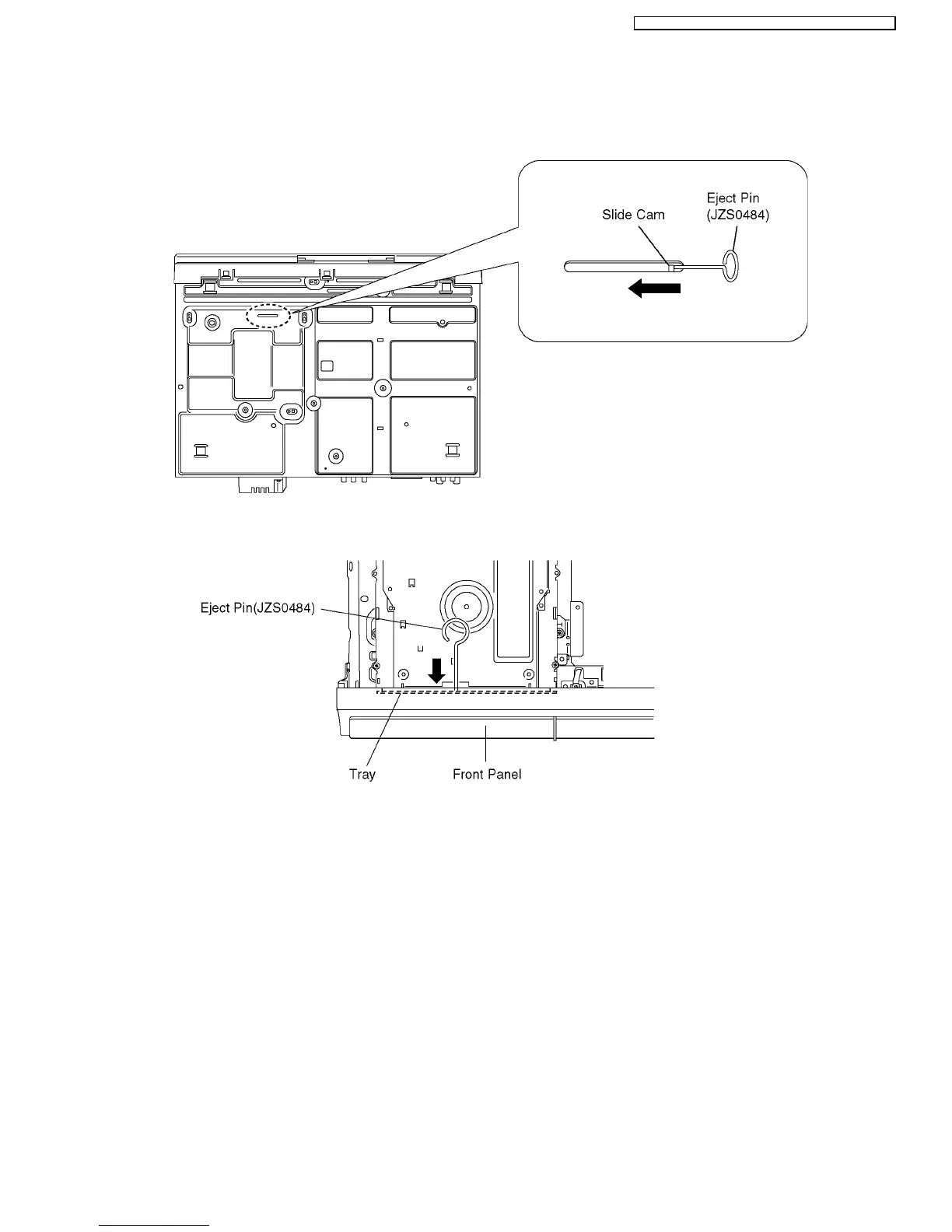 4. Slide SLIDE CAM by Eject Pin (JZJ0484) or minus screw driver (small) in the direction of arrow to eject tray slightly.