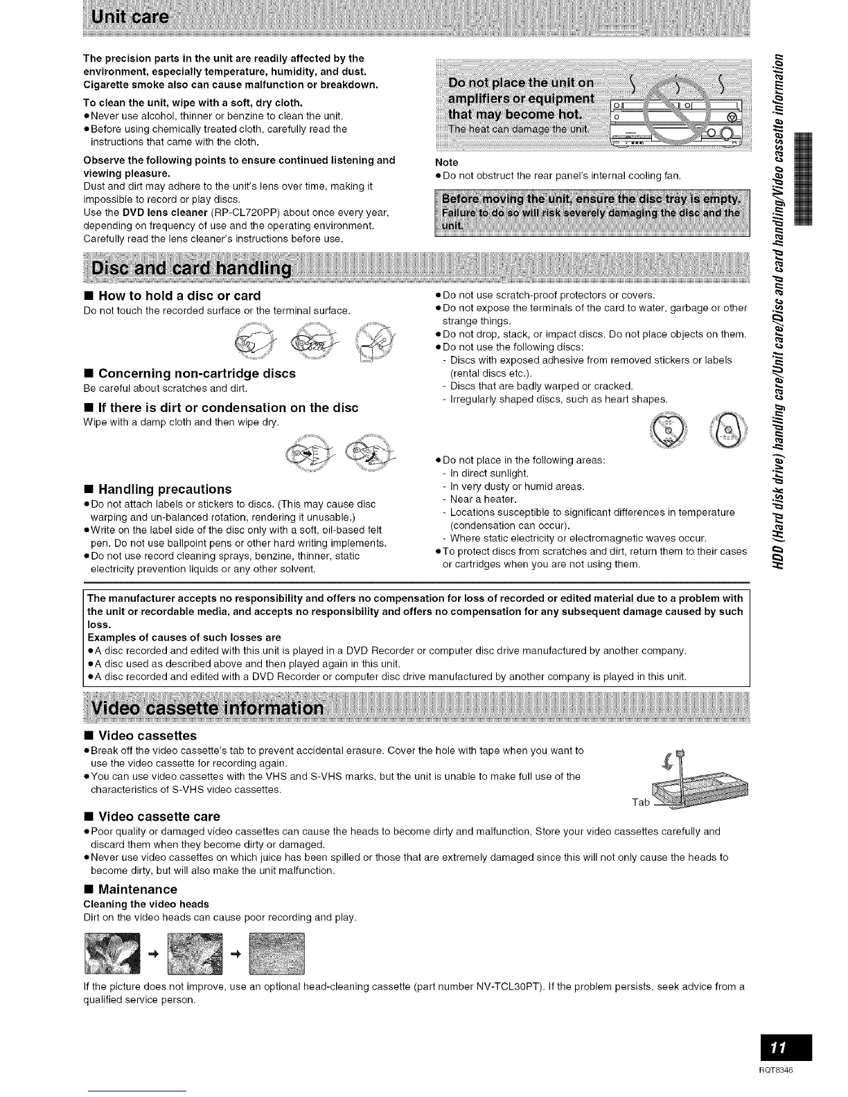 • Never use video cassettes on which juice has been spilled or those that are extremely damaged since this will not only cause the heads to