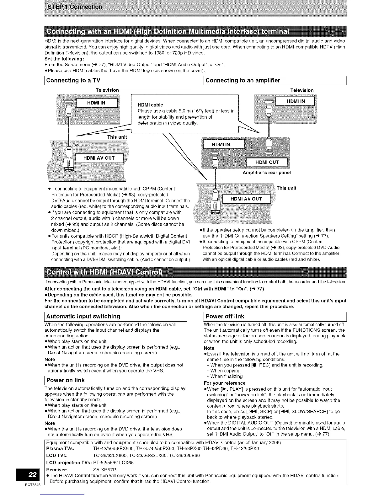 If connecting with a Panasonic television equipped with the HDAVl function, you can use this convenient function to control both the recorder and the television.