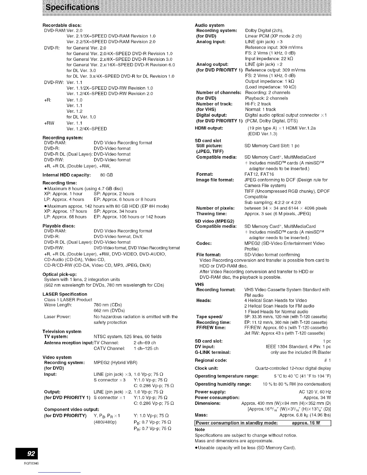 oMaximum approx. 142 hours with 80 GB HDD (EP 8H mode)