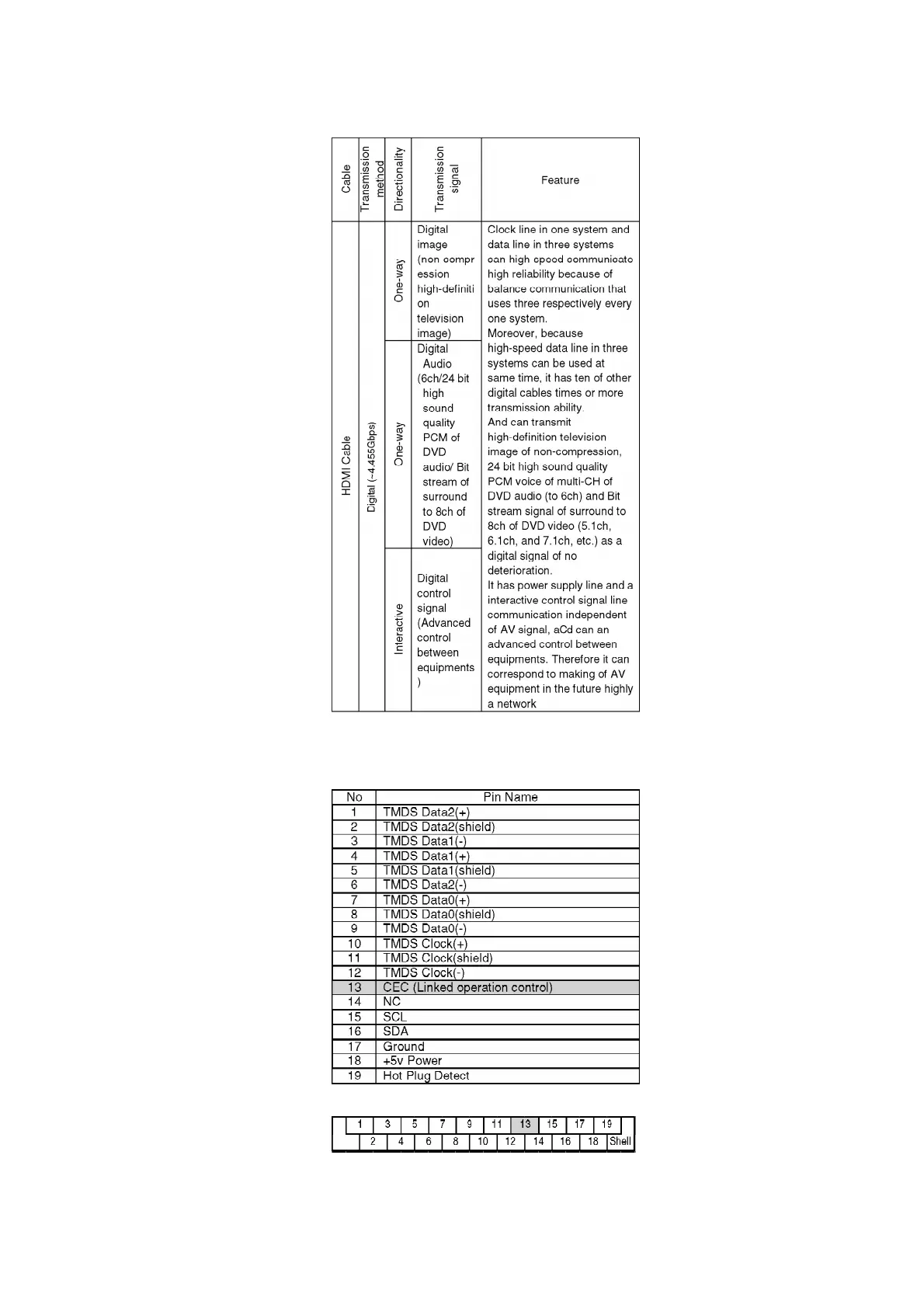 Pin layout of plug of HDMI cable seen from outside.