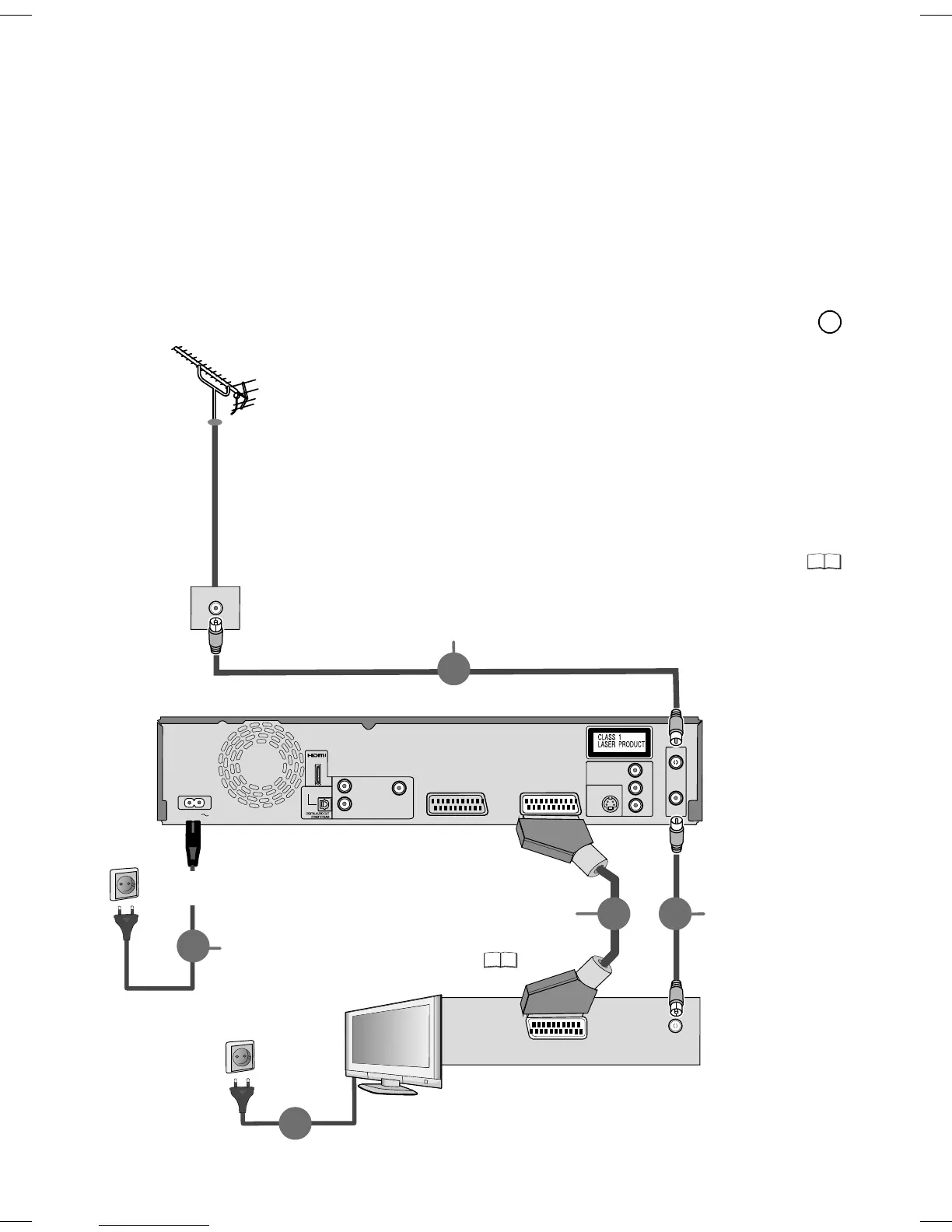 4 Connect the DVD Recorder and the television to the power supply system.