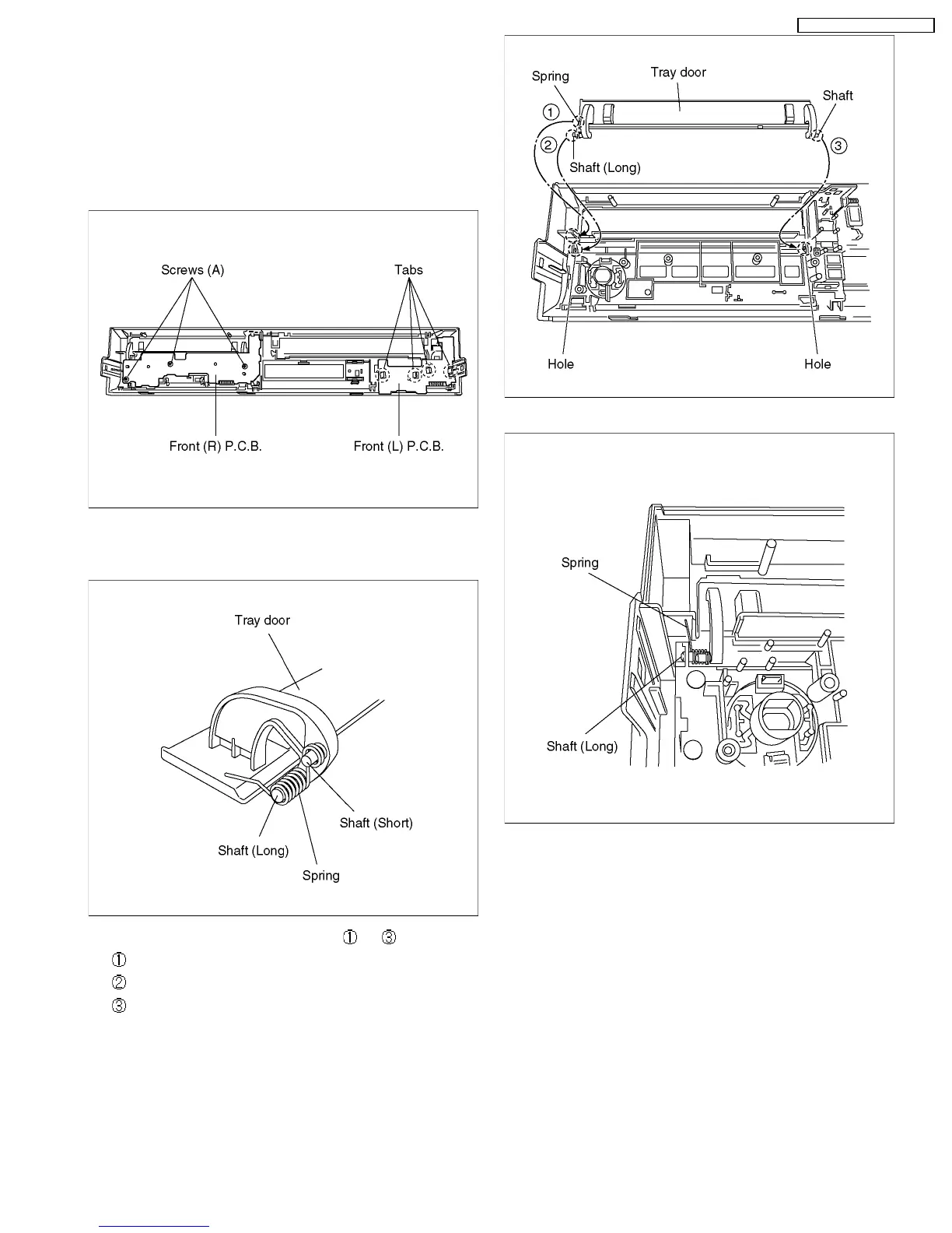 1. Remove 3 screws (A) and tab to remove Front (R) P.C.B..
