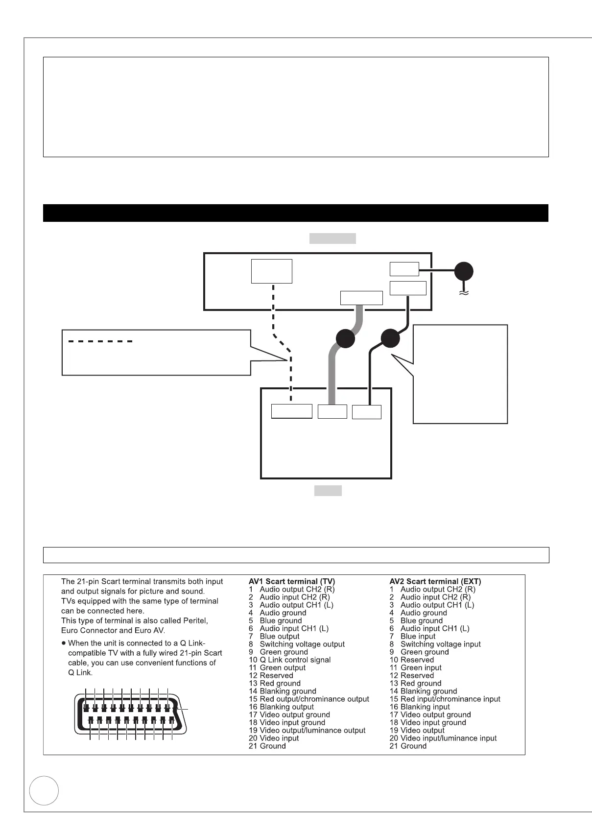 3 21-pin Scart cable from the “AV1 (TV)” on the unit to the “AV” on the TV.