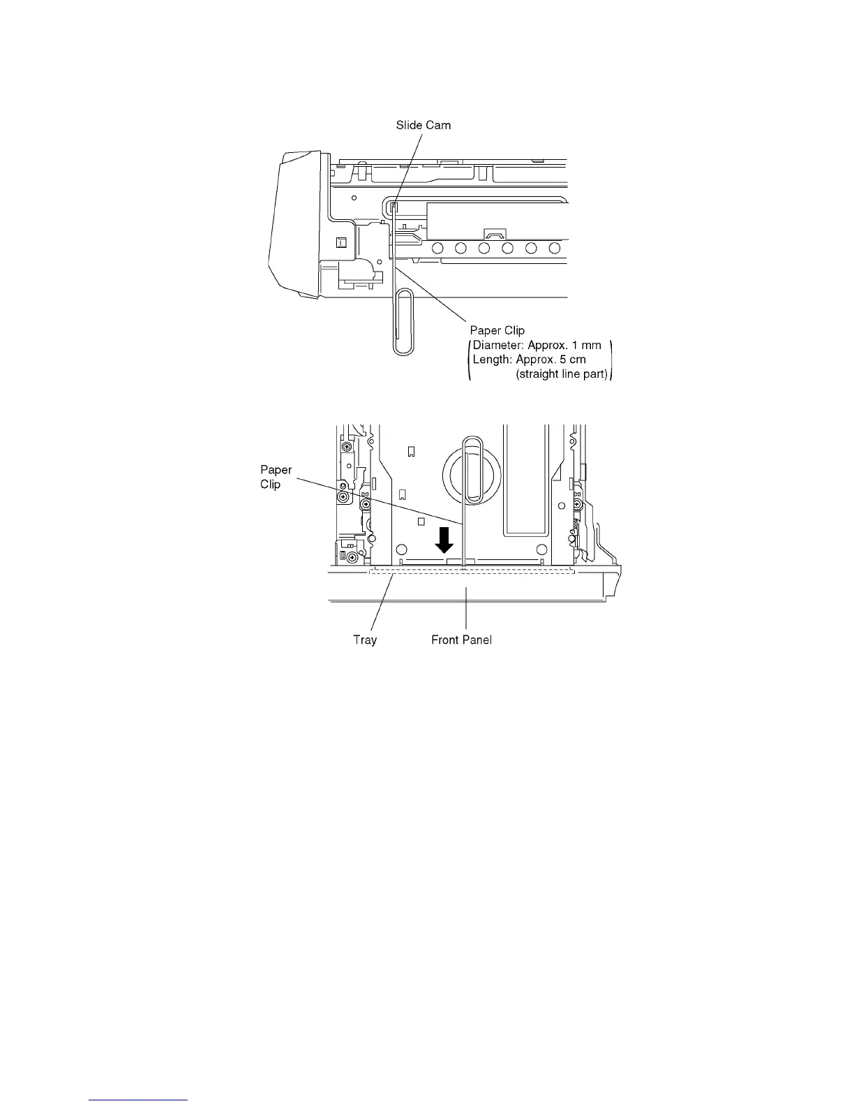 3. Push in SLIDE CAM by Paper Clip or minus screw driver (small) to eject tray slightly.