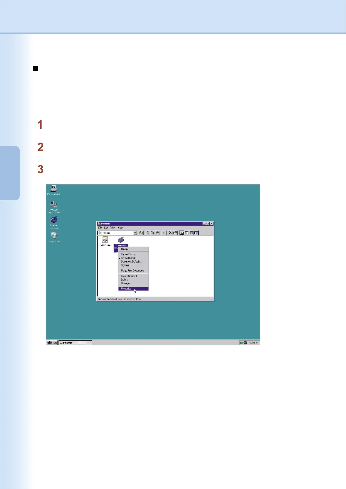 Right-click on the desired printer icon in the Printers folder, and then select Properties in the pop-up menu.