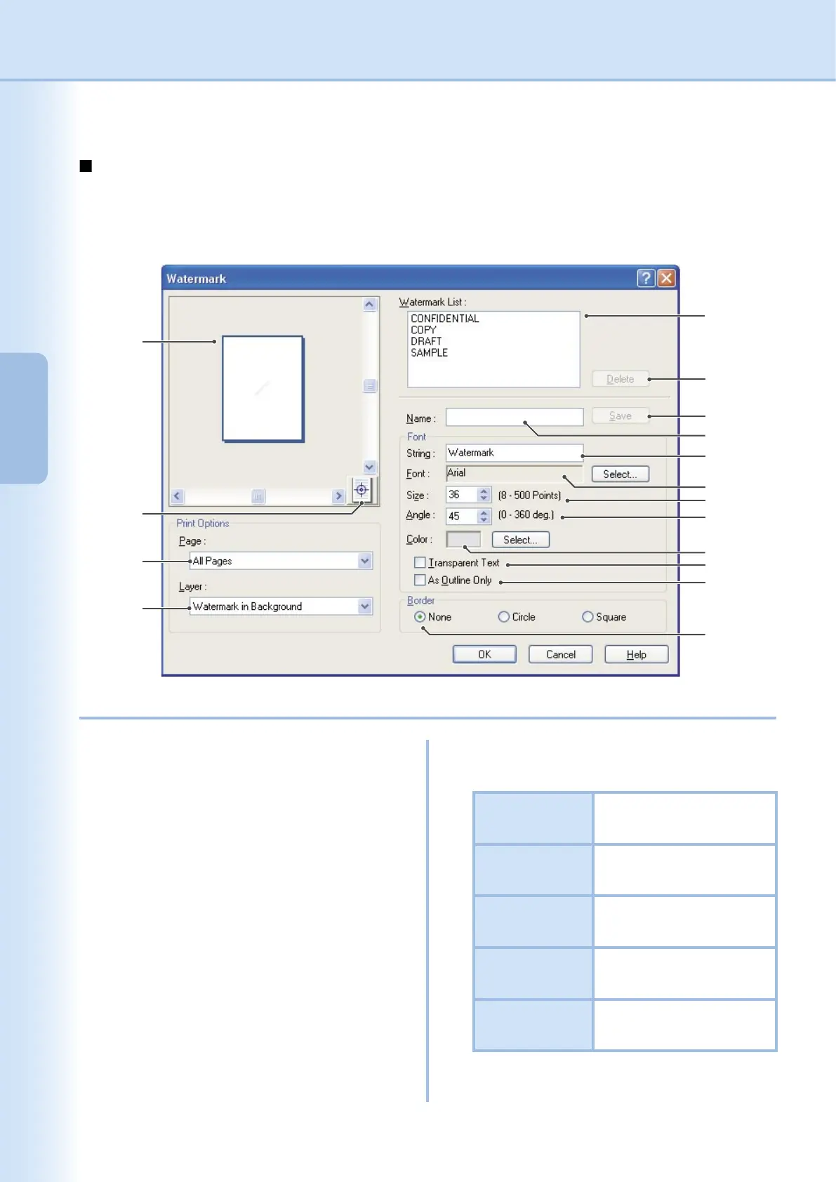 Your choice of text can be printed in the document foreground or background as a watermark. You can also