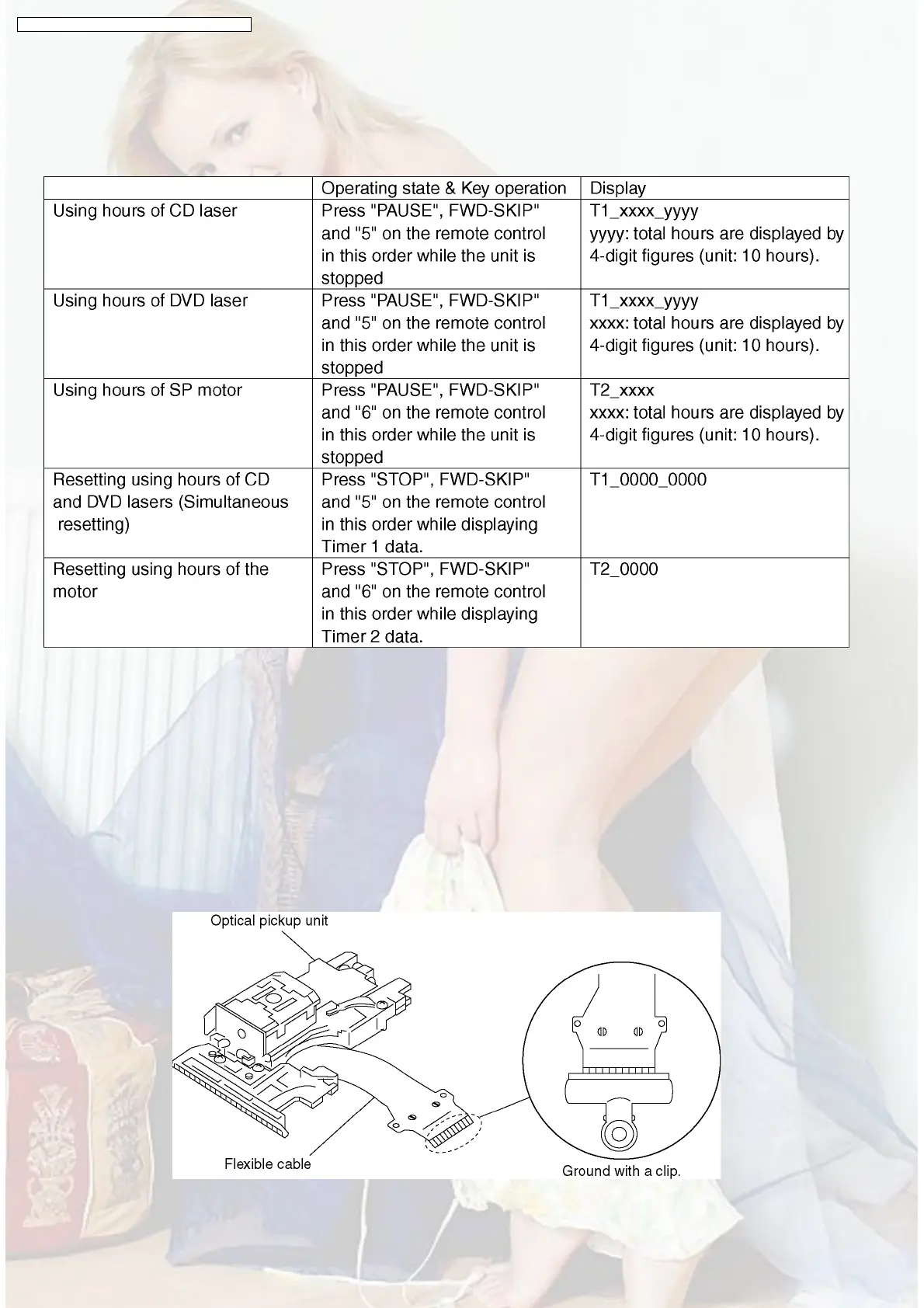 Before replacing the optical pickup unit and spindle motor assembly, check the total using hours for each of them. The checking