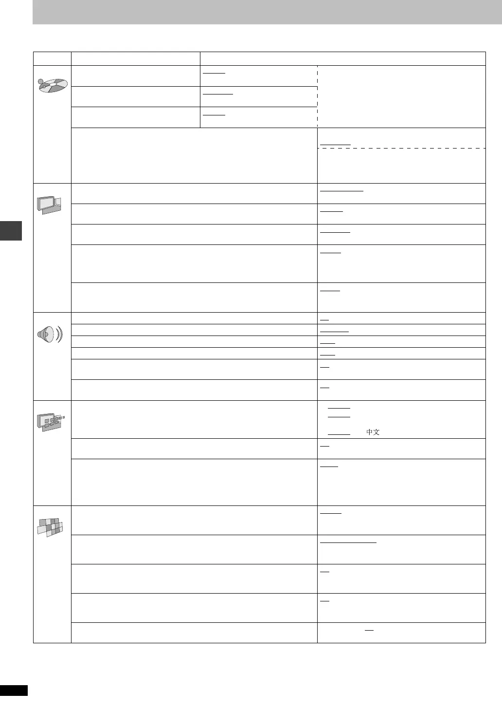 Menus Items Options (Underlined items are the factory preset.)