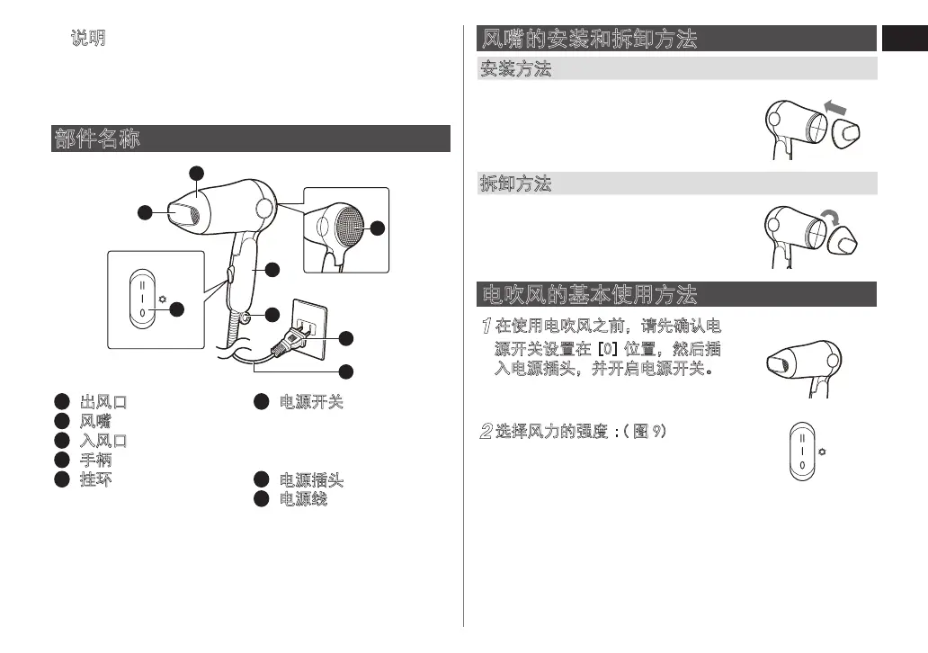 Panasonic EH-ND17 - 部件名称; 风嘴的安装和拆卸方法; 电吹风的基本使用方法