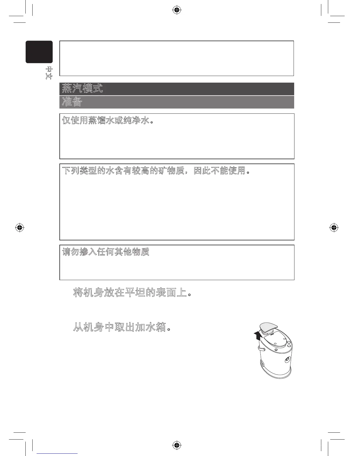 请勿在水中掺入任何其他物质,例如洗液、芳香油等。