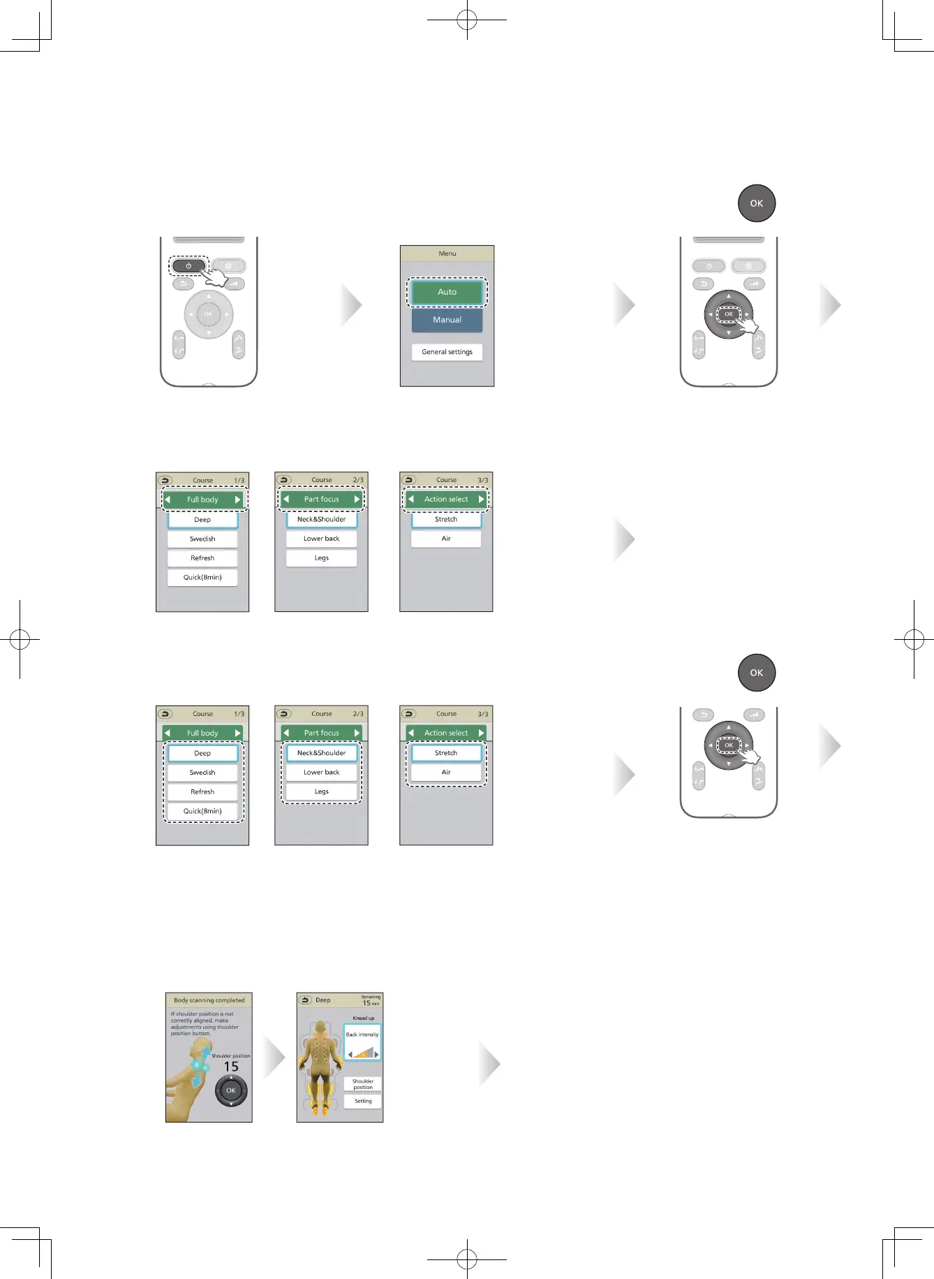 The power is turned OFF automatically if massage is not started and no operation is performed for about 3 minutes.