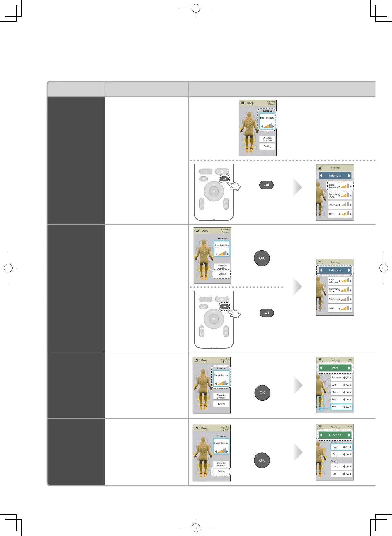 It is possible to adjust to your liking the adjustments and settings, etc., during massaging.