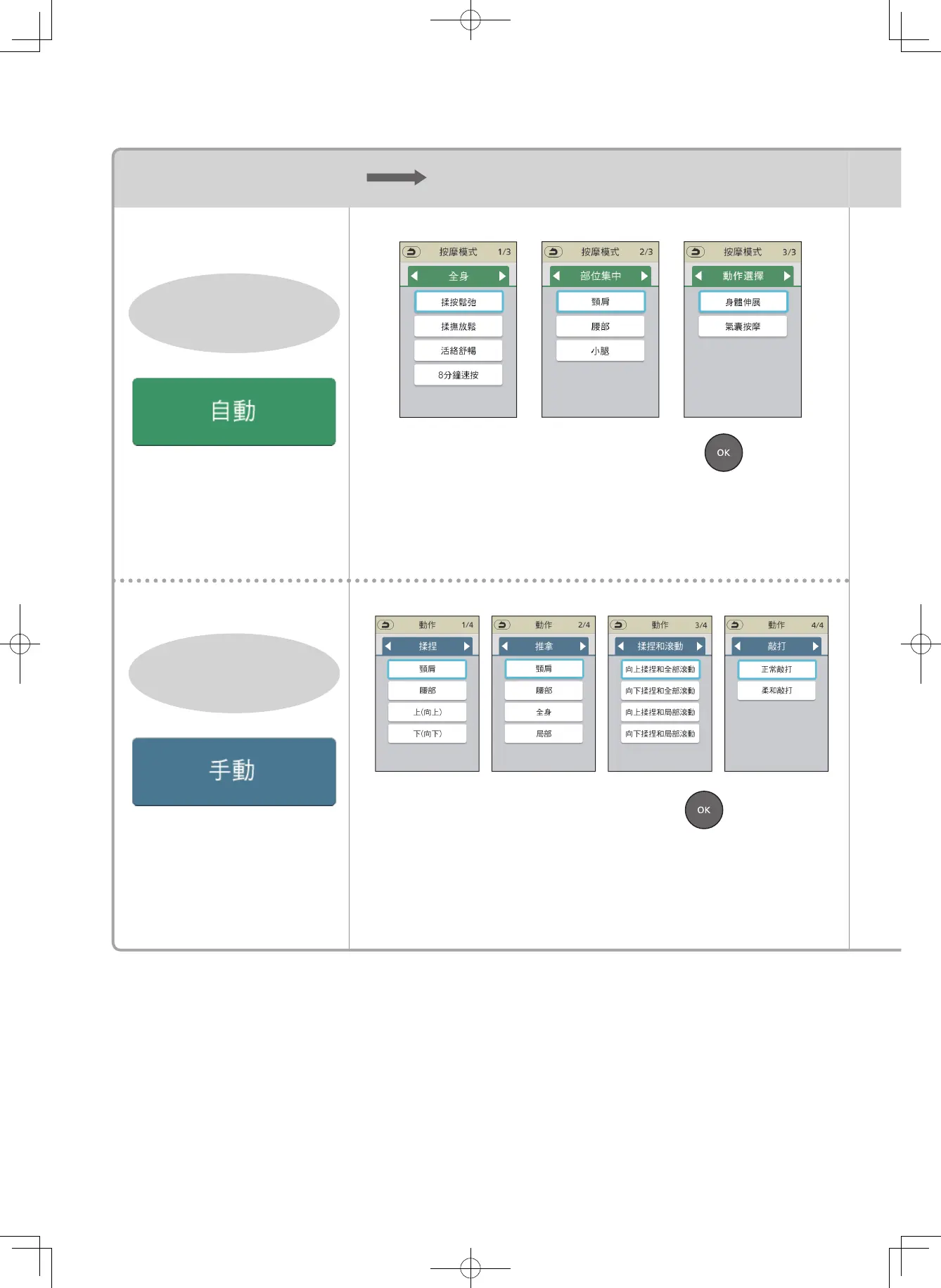 選單 按摩模式和動作選擇 體型偵測 開始按摩並依個人喜好調整