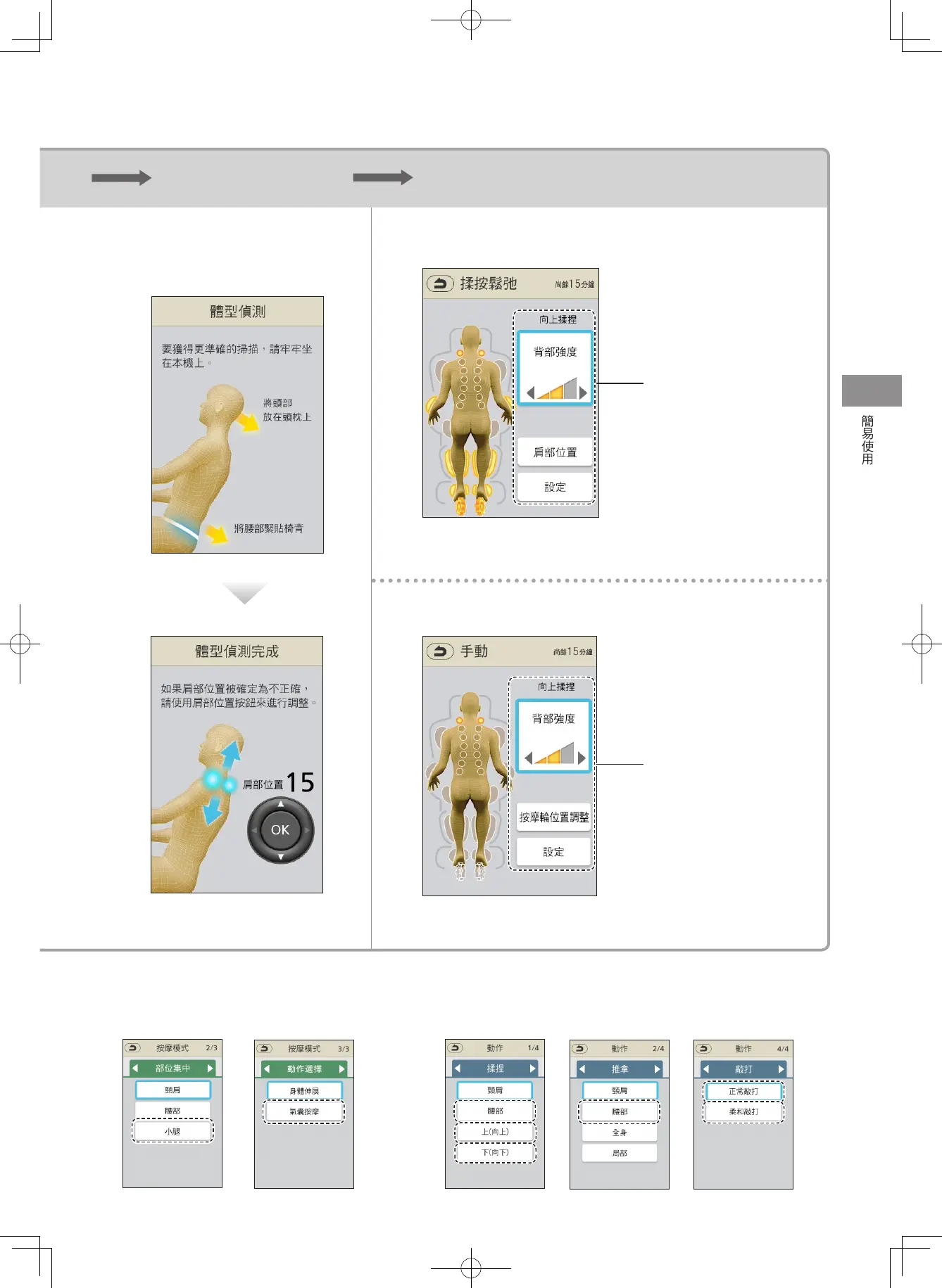 選單 按摩模式和動作選擇 體型偵測 開始按摩並依個人喜好調整
