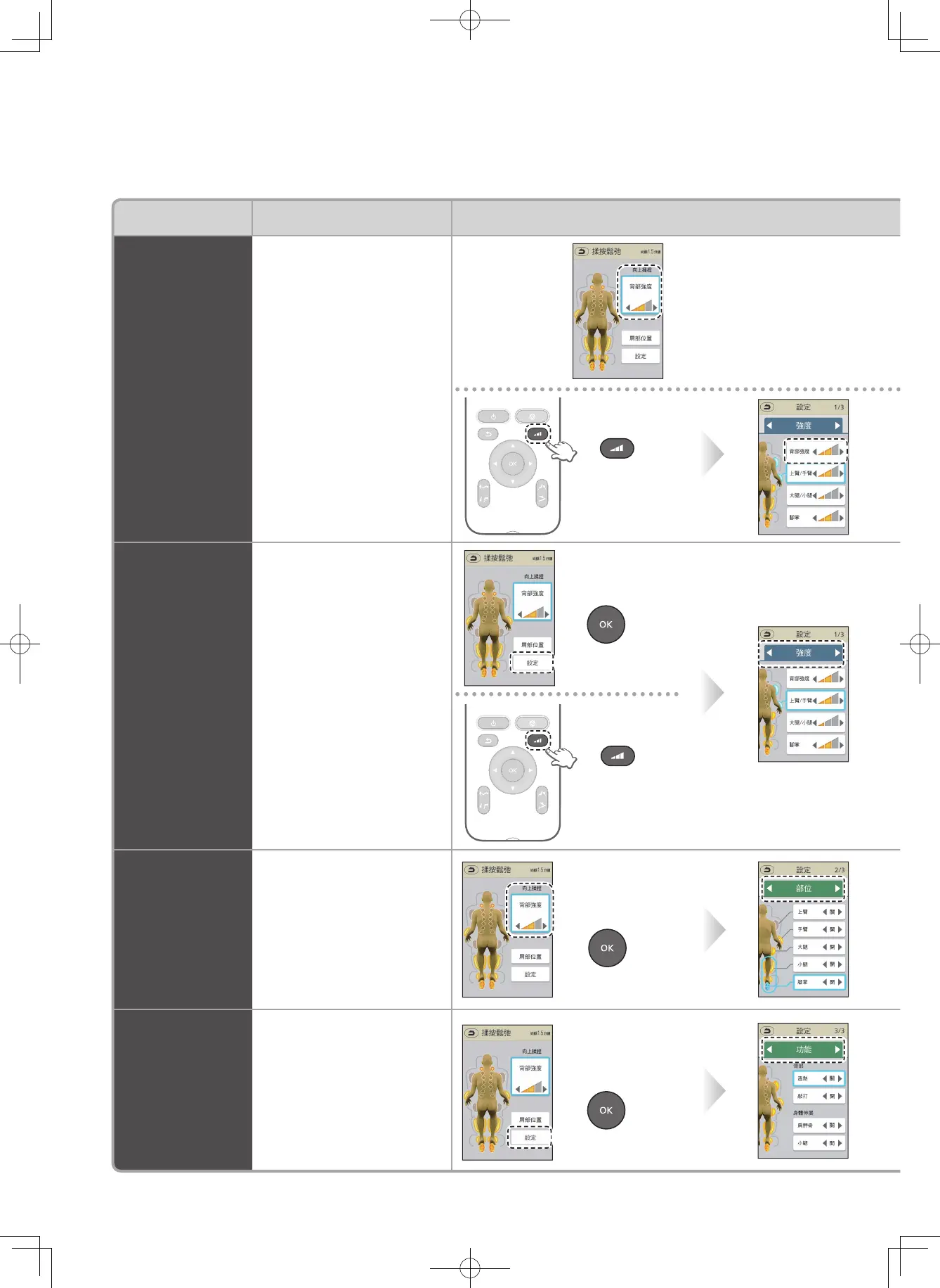 您可以在按摩期間依個人喜好調整和設定。
