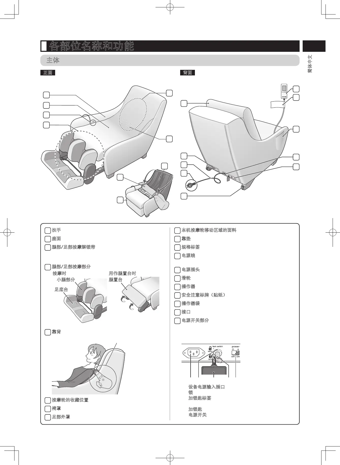 用于取出和收起腿部/足部按摩部分。