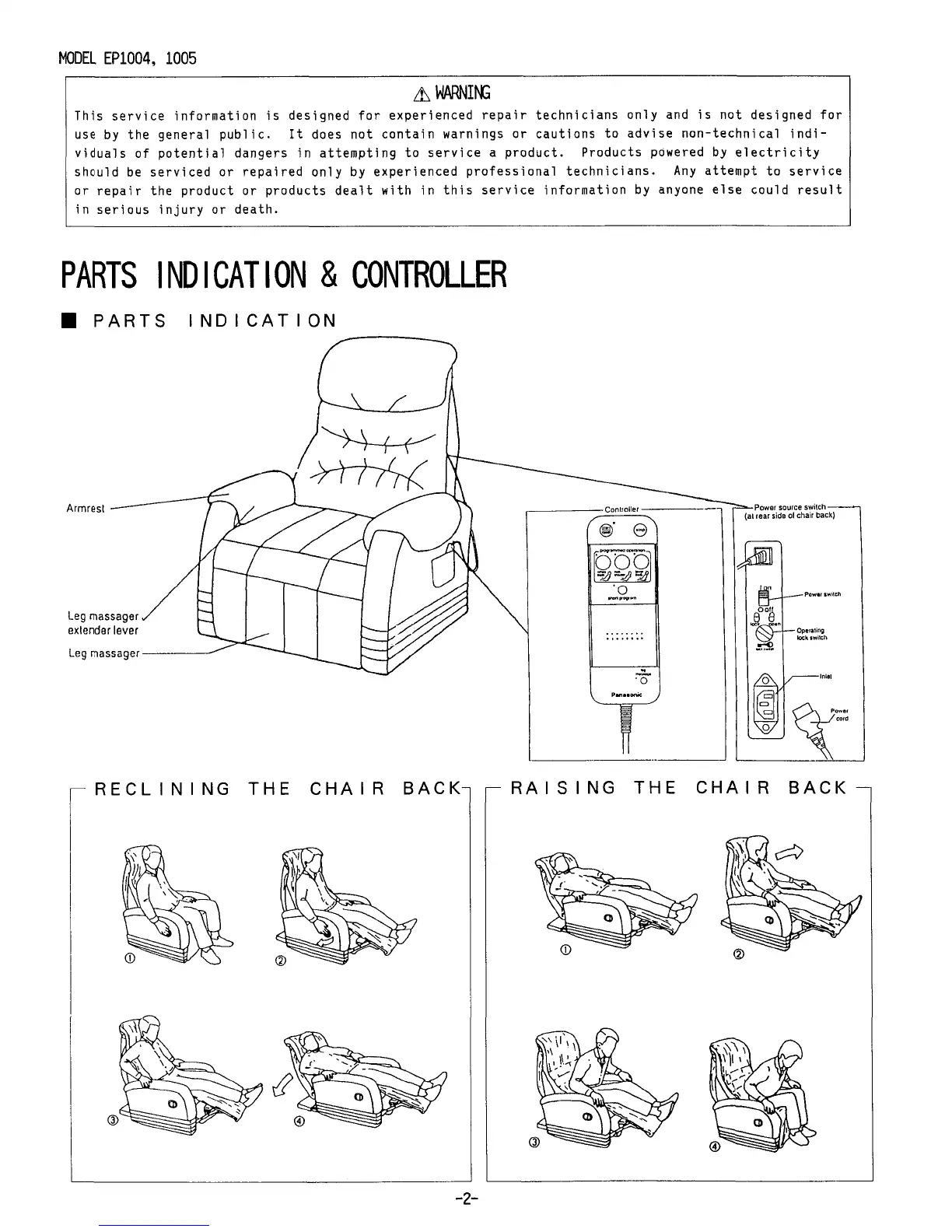 Panasonic EP1004 - Parts Indication & Controller; Reclining the Chair Back; Raising the Chain Back