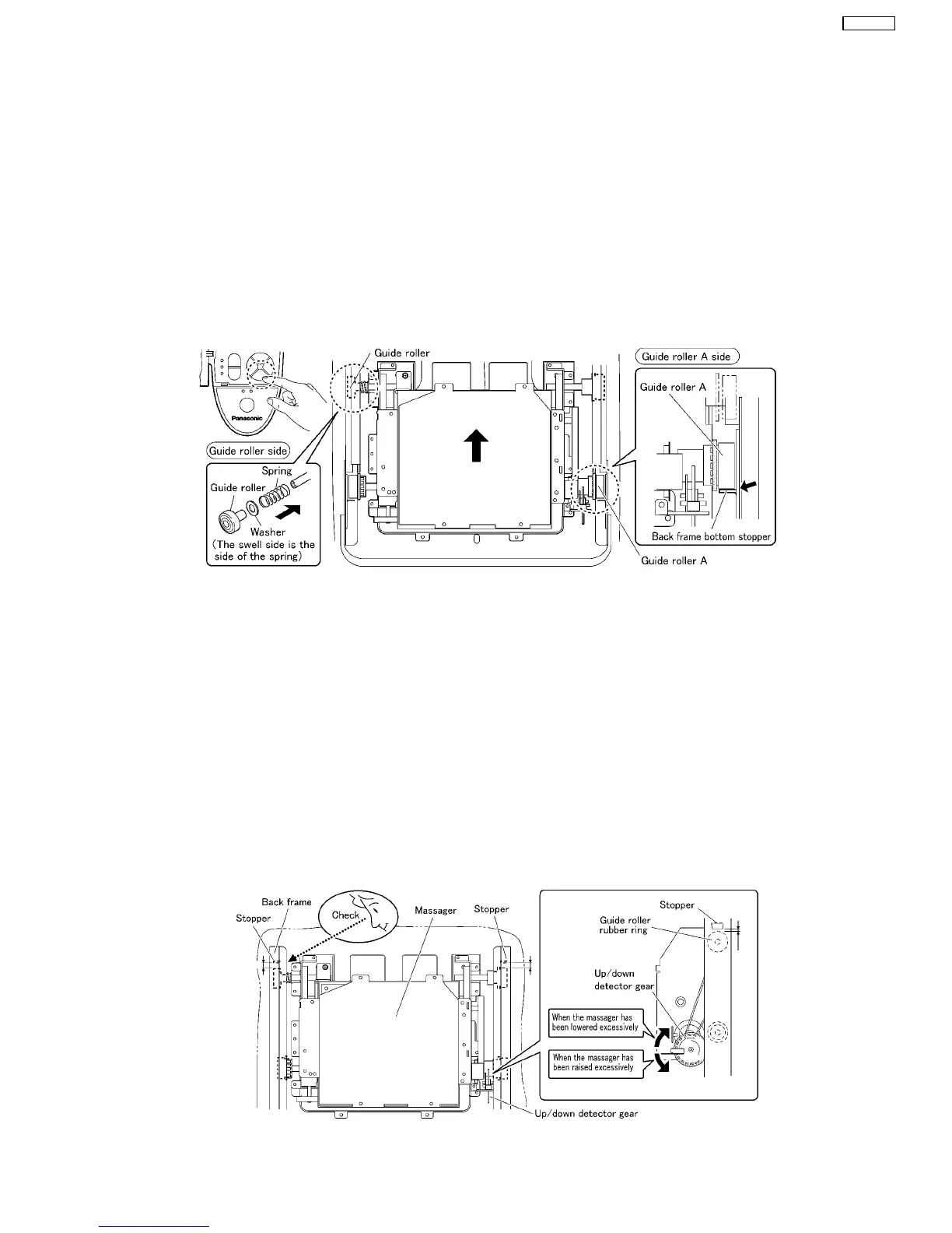 2. Install a washer and a spring to the guide roller G in the left side and mount the massager on the lowest position of the back