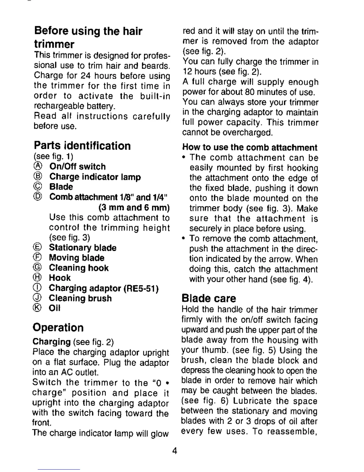 Panasonic ER-121 - Initial Setup and Operation; Preparing the Hair Trimmer; Trimmer Charging Procedure; Using the Comb Attachment