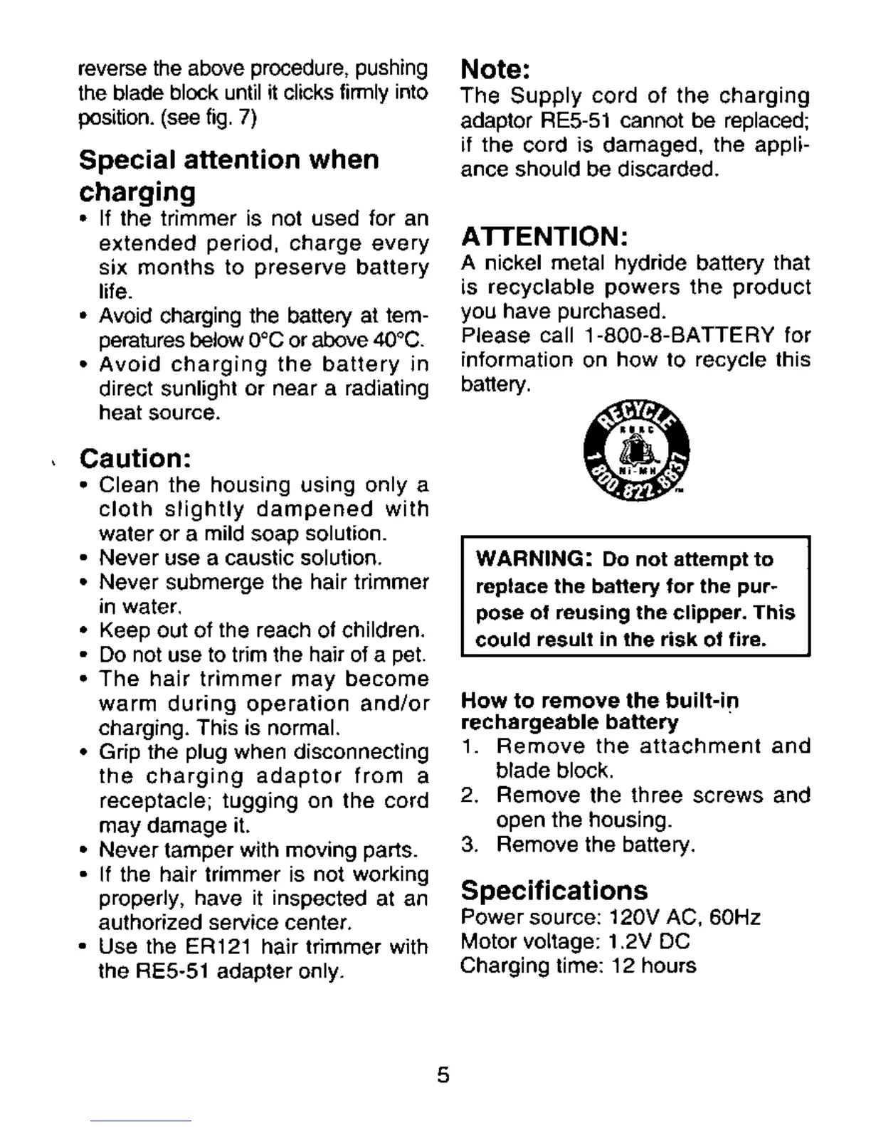 Panasonic ER-121 - Advanced Usage and Care; Special Charging Considerations; General Handling and Precautions; Important Notes and Warnings